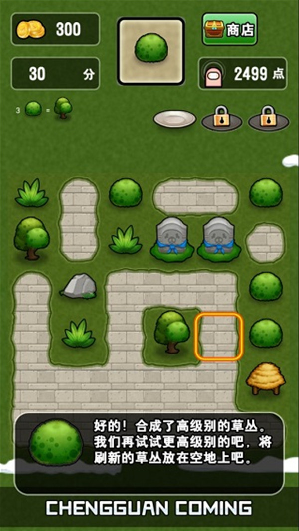 点击空地种植小草,相邻的同类草丛可自动合成。