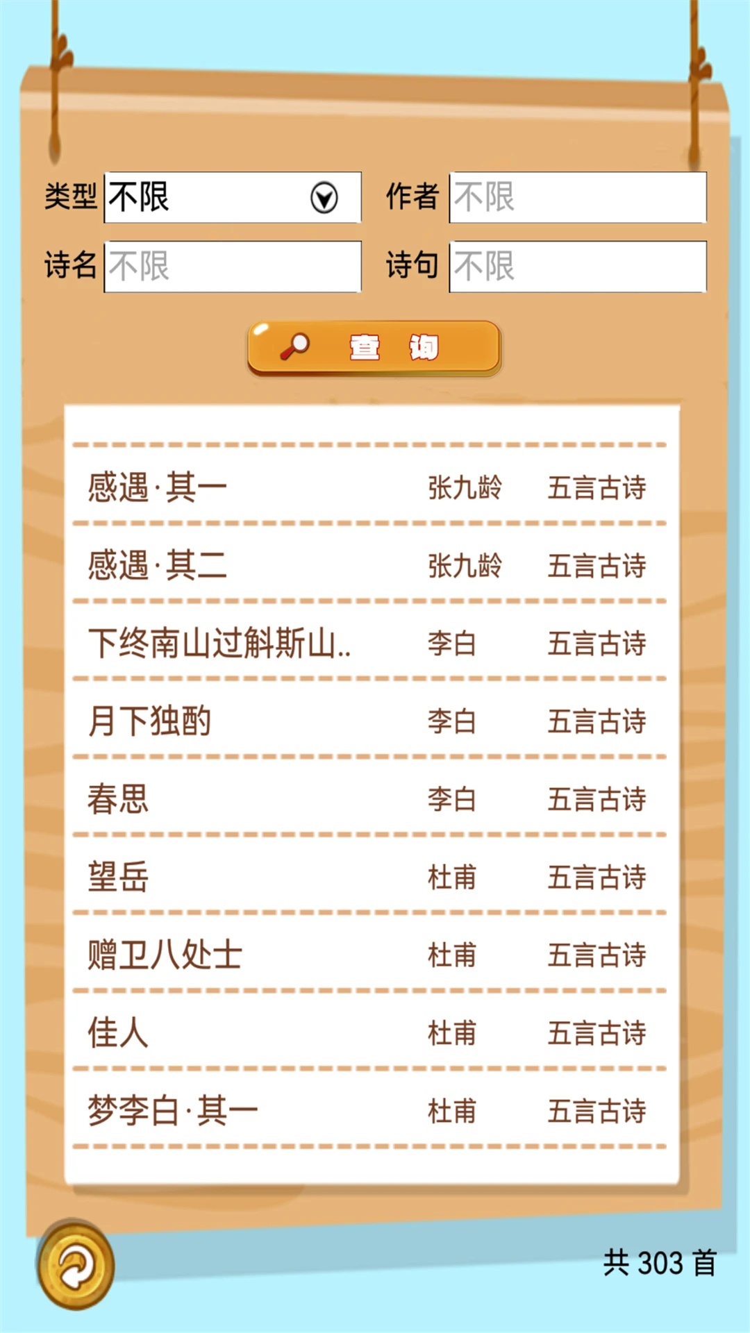 软件以唐诗为中心设计了多款模块,包括:唐诗三百首,拼诗小测验,诗句补缺,唐诗点读等,让您以寓教于乐的形式完成唐诗考核小关卡,巩固学习成果。