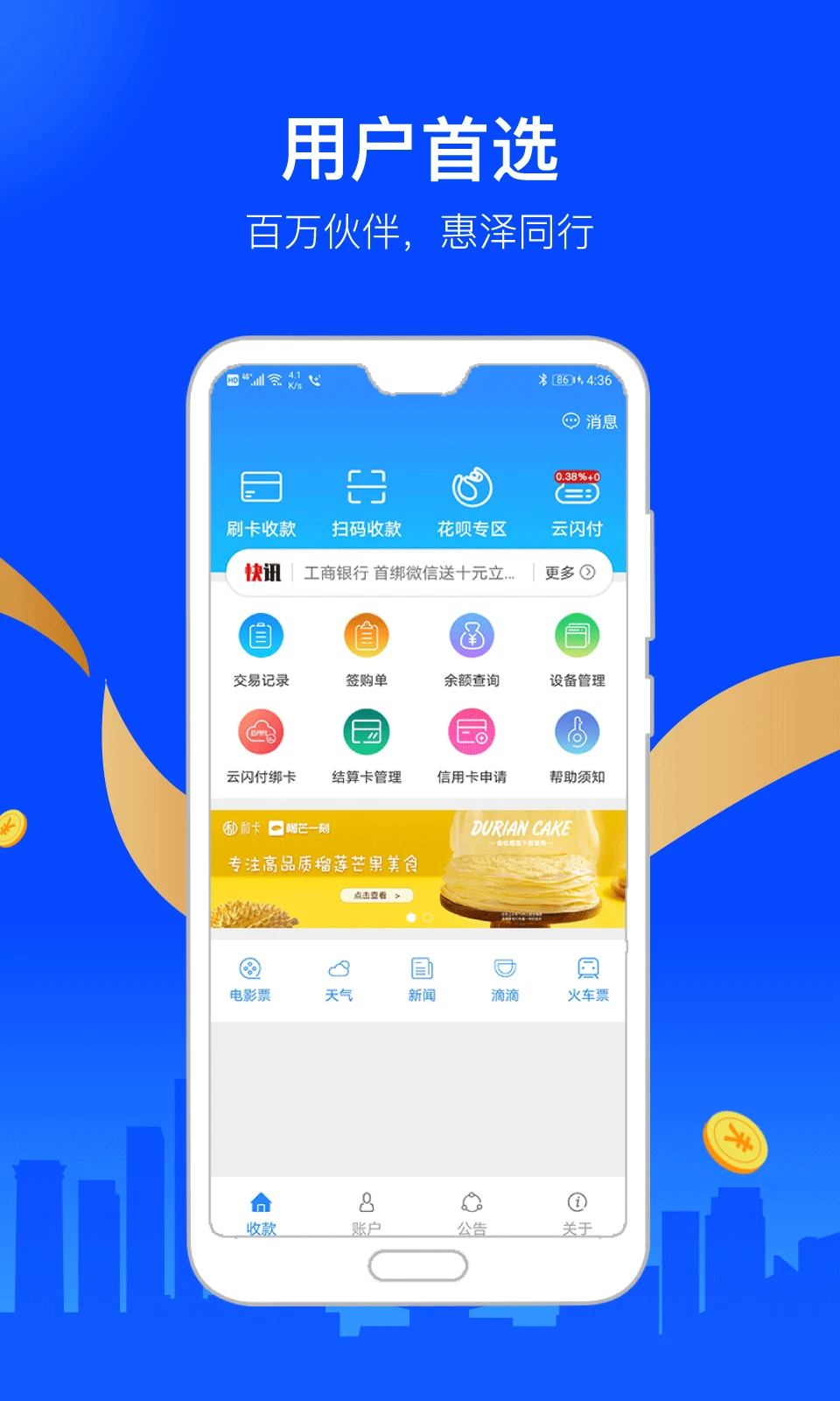 刷卡收款:通过与会员宝收款器连接,随时随地刷卡收款;