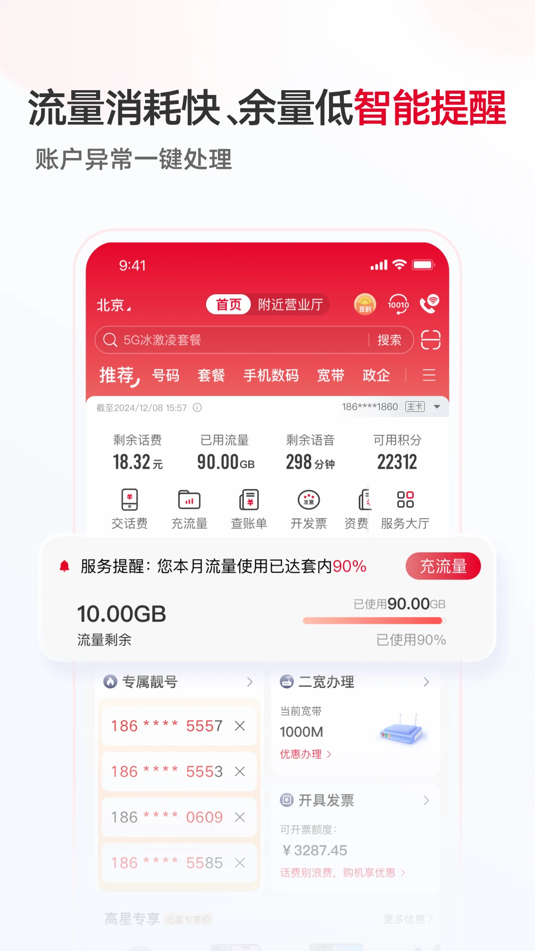•账户提醒:停机、挂失等异常问题,一键直达处理页面。