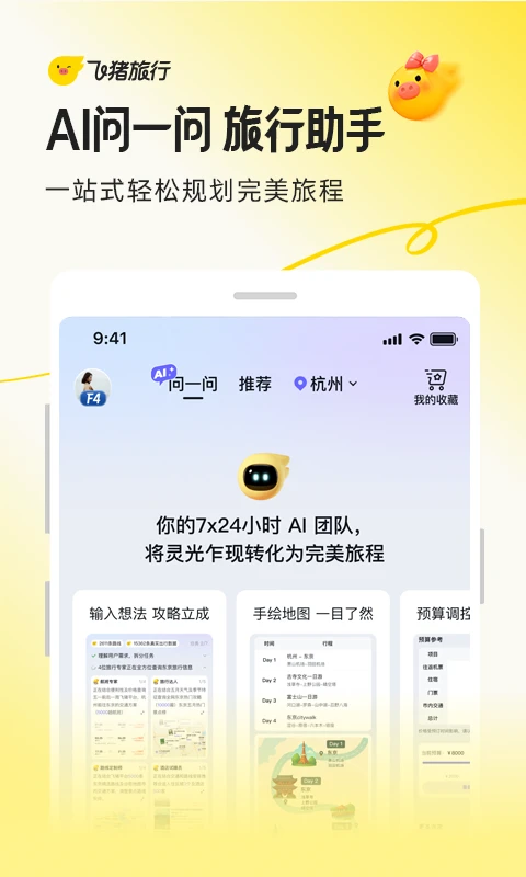 1.「旅行助手」飞猪全新推出AI“问一问”,可随时随地为您挑选有性价比的机票、酒店和目的地,提供更准确、更有温度、可即时预订的旅行方案,帮您省去用多个App查询信息、拼凑攻略、反复比价的麻烦,它好比一支7*24小时在线的AI旅行定制团队,帮您轻松规划完美旅程。