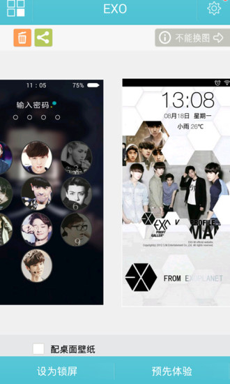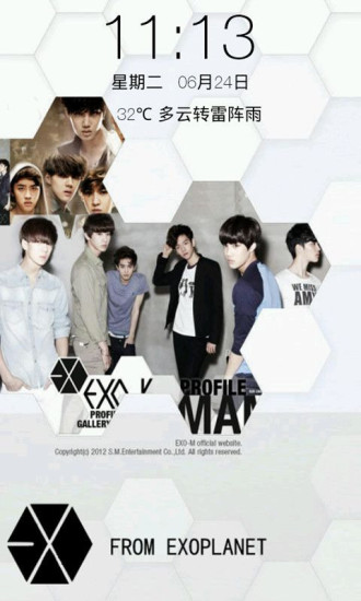 人气组合exo主题锁屏:此款锁屏肯定是行星饭们不容错过的锁屏,流畅的解锁方式,加上锁屏中还加入数字密码和手势密码双重密码双重保护,另外还可以轻松播放音乐。锁屏完全屏蔽home键,赶快来体验吧。另外锁屏中还加入极难解锁,连续点击1230这四个数字就可以成功解锁。