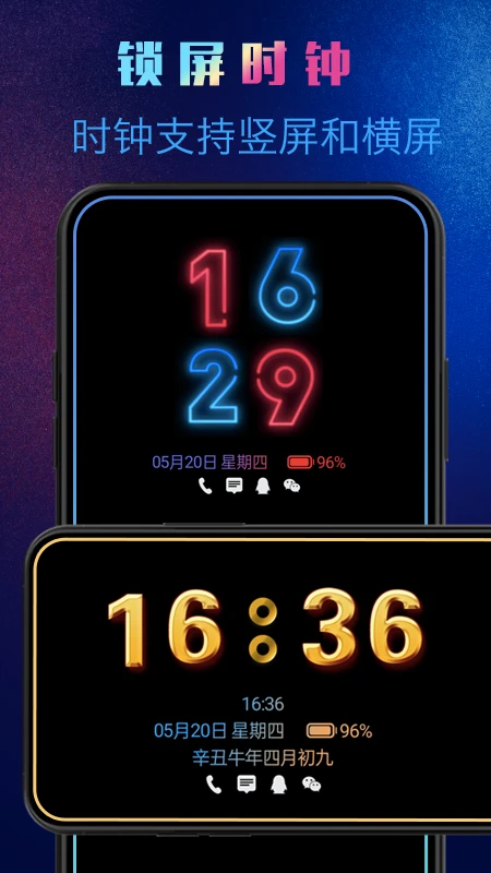 全屏渐变时钟给你带来不一样的感受,个性的界面设计,醒目的时间显示,日期和农历显示,