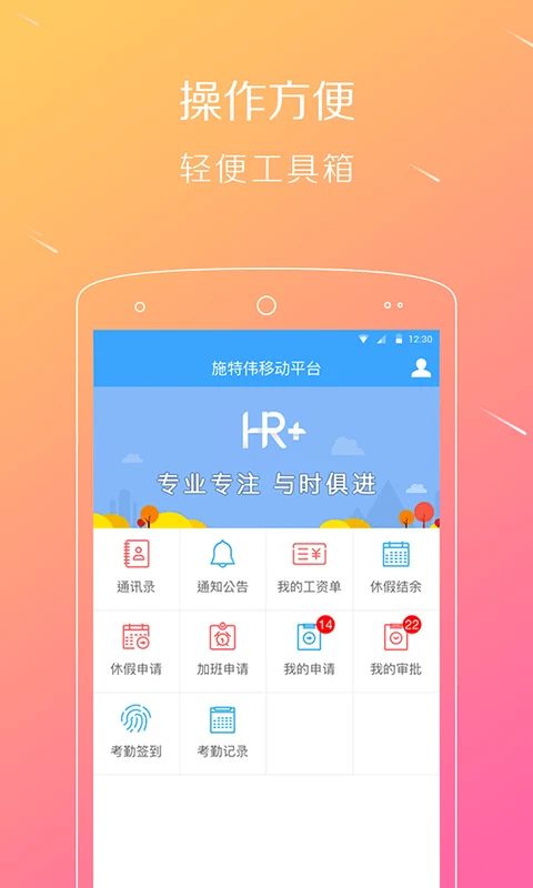 移动HR+是施特伟软件崭新的“iHRPLUS V6”管理系统移动终端的创新应用,是人力资本管理方案的战略延伸。企业员工可以随时随地通过移动设备与HR管理信息系统进行实时无线的交互,实现人力资源管理业务的协同应用。