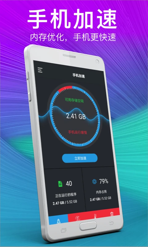 手机垃圾清理大师,一键清理释放内存,手机运行加速的清理软件,有效解决手机使用过程中的一切卡顿、耗电、内存不足等问题。