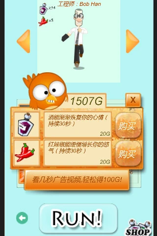 本游戏为休闲动作游戏,利用左右闪避和角色特有的技能拼命逃生。需要时刻注意角色的心情和愤怒值,当心情降低为零或出现交通事故时(你懂的,不要随便横穿马路),游戏视为结束。在游戏过程中玩家可以获得金币,购买和使用道具帮助你跑的更远。本来是有更多的角色和故事情节的,但我十分希望更早的看到大家对游戏的反馈,如果大家愿意支持我和这款游戏,我将在后续版本中添加更加多且丰富的内容。