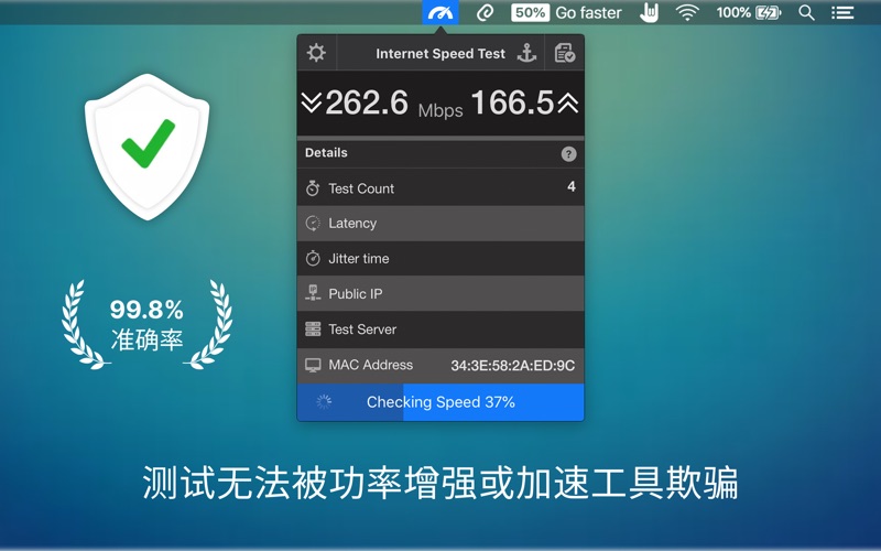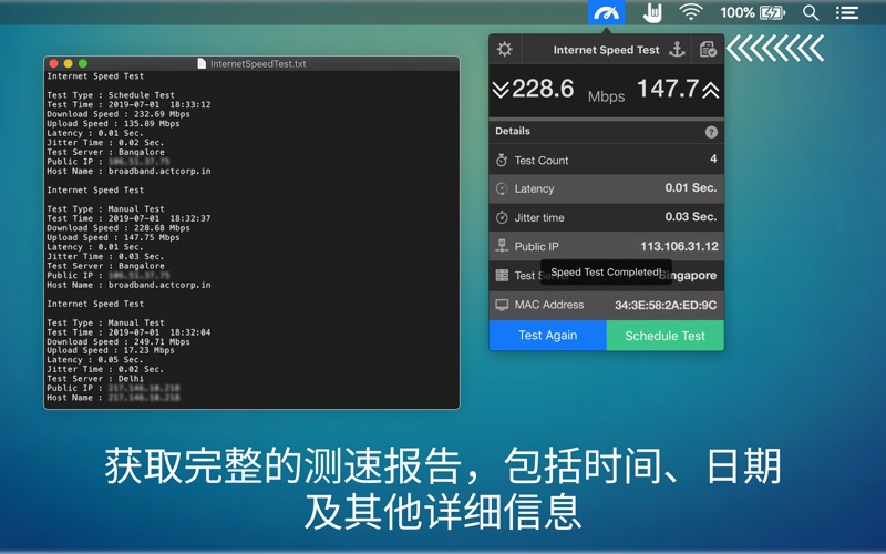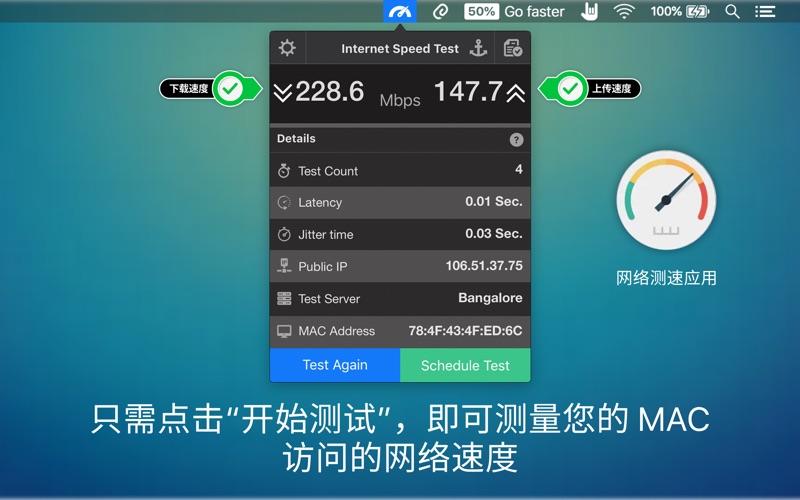 ■ Internet Speed Test使用独特的算法来执行速度测试。 ■ 不能通过PowerBoost或类似的速度增强工具来欺骗它。 因此,根据Mac Internet数据速度,您获得的结果将是准确的。 “ Internet Speed Test”应用程序是单线程测试,而其他大多数应用程序(例如Speed Test Dot Net)都是多线程的。它使用单个连接下载示例文件,该文件与您日常浏览和下载中的实际操作更加接近。 ≈ 特点:≈ ◉ right从菜单栏中直接单击Internet速度测试。 ◉ 网络连接的上传和下载速度。 ◉ 安排固定间隔时间进行Internet Speed测试。 ◉ Speed通过设置持续监视的时间间隔来进行自动速度测试。 ◉ 以日期和时间的文本格式(.txt / .csv)导出测试报告。 ◉ 获取计算机的公共IP和MAC地址。 ◉ 网络连接在菜单栏中显示为深灰色图标。 ◉ 也可以使用Ookla(speedtest.net),Netflix(fast.com),AT&T和Google(光纤速度测试)进行测试。 ◉ tina视网膜显示启用的图标。 ◉ 易于使用的界面。 ◉ 市场上最好的。 ≈ 基础知识:≈ ■ 测试计数:完成以获得准确结果的测试数量 ■ 延迟时间:在观察到的系统中某些物理变化的起因和结果之间的时间延迟。 ■ 抖动时间:信息块(称为数据包)在网络上传播所花费的时间 ■ 公用IP:您的公用IP地址是当您通过Internet连接连接到各种服务器/设备时记录的IP地址。 ■ 测试服务器:服务器的位置用于确定您的互联网速度。 ■ Mac地址:分配给网络接口以在物理网段上进行通信的唯一标识符。 ********************************************************************************************************** ≈ 用户评论:≈ ◎ 这个程序做一件事,它做得很出色。与其他公司不同,它可以找到最接近的ISP,并通过“ Edinaman”为您提供快速直观的了解 ◎ 这是一个很棒的应用程序,我认为我不会像以前那样使用太多。允许人们获得比互联网速度测试更多的信息。如果您身上有怪胎,请尝试一下。在Mac上效果很好,并且非常准确-由“ Docmarkon”撰写 ◎ Internet Speed test完全适合我的需要,它是一种用于我想要的速度检查的快速菜单栏工具。 -“ Wannabecool” ********************************************************************************************************** 注意:对于任何问题,建议或报告错误,请发送电子邮件至support@appyogi.com。我们希望听到您的想法和建议,以改进应用程序的未来版本。我们会积极进行更新,以提供改进和新功能。 应用内购买条款 - 可以按月,半年和每年的非自动可再生订阅方式进行自动速度测试。 - 付款将在购买时从您的iTunes帐户中扣除。 ■■■ 感谢您使用网速测试应用程序■■■ 我们修复了崩溃、错误并进行了一些改进,以增强您对应用程序的体验。 如果您喜欢 Internet Speed Test 应用程序,请在 AppStore 上给我们评分! 我们将永远感谢您。