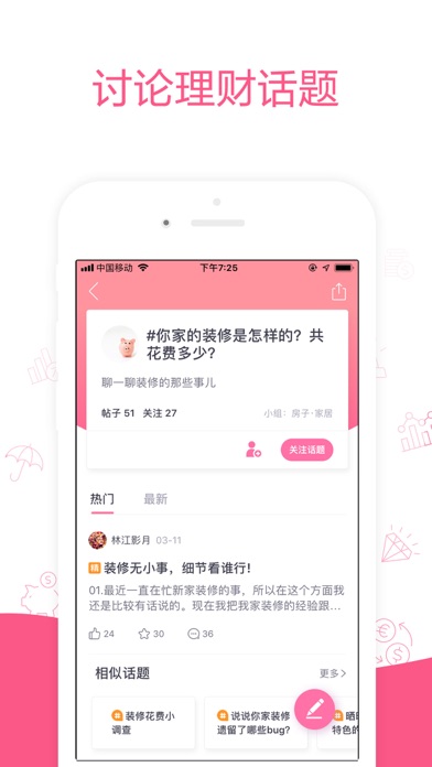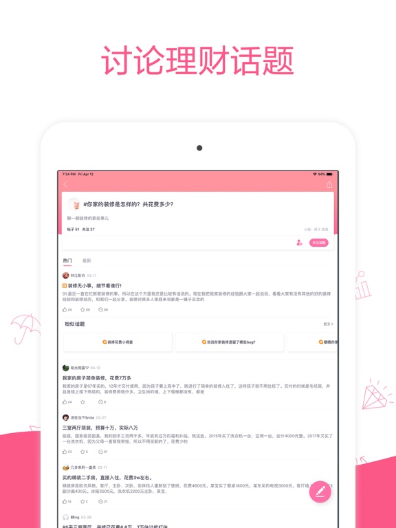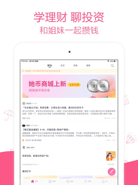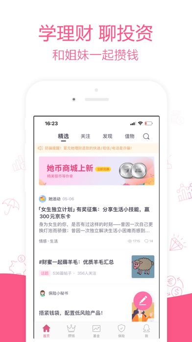 她理财app是专为女性打造的理财生活学习交流社区,提供通俗易懂的理财课和简单实用的理财小工具,帮助女性用户攒钱赚钱,实现财富增长,提高生活品质。 热辣新鲜的话题讨论: 单身女要不要婚前买房? 20多岁的女孩,先脱贫还是先脱单? 女生应该投资外表还是资产? 收入多高能买奢侈品? 好女该不该嫁凤凰男? 结婚后谁管钱?如何管钱越管越多? 人气火爆的小组: 【攒钱圆梦】人生第一个10万、一起攒钱去旅行、圆梦清单、攒钱打卡、万万没想到的攒钱大法…… 【综合理财】1万元如何投资收益最大化?月入3000如何理财?30岁前这样理财多赚百万…… 【基金可以这样玩】小白如何从0开始买基金?如何定投能盈利30%?如何挑选好基金…… 【玩转信用卡】信用卡羊毛大全、积分换机票攻略、如何申请大额信用卡、如何提升芝麻信用…… 【21天变财女】财女读书会、组团学英语、一起考证、健身打卡,遇到更好的自己…… …… 通俗易懂的理财课: 理财入门 工资规划 家庭财务 低风险投资方法 贷款、公积金小科普 …… 【联系我们】 微信公众号:她理财(talicai) 微博:@她理财 邮箱:talicai@talicai.com 问题反馈QQ群:465601017修复iOS18上闪退的bug