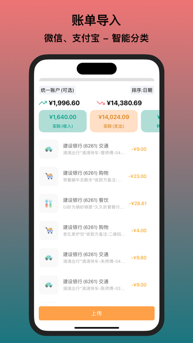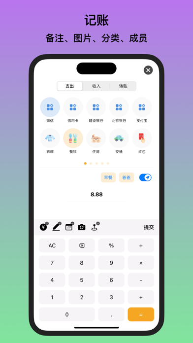 今日记账 -- 一款支持弹幕的记账APP,和志同道合的人一起记账吧 【特性】 - 账单导入:微信账单 、 支付宝账单 、其他账单 ,并且智能对账单进行分类,且账单导入后统计的金额完全和微信支付宝统计的金额一致,自动识别并排除转账类型,自动识别退款,且支持账单去重 - 免费、无广告:无各类烦人理财、社区等 【弹幕】 记账不孤单,和成千上万人一起记账吧 【双平台】 支持两种手机系统,数据云同步:多端、多人数据共享,防止数据丢失的同时,避免了换手机的烦恼。 【安全/隐私】 - 秒级数据备份,加密存储. 【记账】 - 可自定义账户,例如“微信”、“支付宝”、“银行卡”、“信用卡” - 自定义分类,例如“交通”、“餐饮”、“住房” - 自定义二级分类,例如“早餐”、“午餐”、“晚餐” - 自定义消费成员,例如“爸爸”、“妈妈”、“姐姐” - 转账 - 退款 - 预算管理 - 时间、地点、图片、备注、金额均可记录 - 模板记账 - 自动记账 【统计】 - 消费日历 - 查看每日收支 - 折线图 - 查看收支波动 - 柱状图 - 查看消费分类占比 - 饼图 - 查看消费账户分配 - 环形图 - 查看收支比 - 进度图 - 查看各项预算 【个性化】 - 夜间模式 - 多种主题切换 - 超过500种成员头像可供选择 【可信赖】 长期更新维护 【其他】 - 搜索 - Machine Learning - 支持iOS14桌面小组件 【联系我们】 请发送电子邮件到: book.ios@lessimore.cn 或者 通过账单导入教程加群以获得更快回复 自动订阅会员说明 1、服务名称:今日记账VIP会员连续包月(1个月)、今日记账VIP会员连续包月(1个月)学生专项 2、价格:连续包月产品为5元/月,学生专项则为3.99元/月,该价格可能会在促销时期会有所变化。当价格调整发生时,新的费用将会在您的下一个订阅周期发生 3、购买自动订阅会员的账号,会在每个月订阅期到期 前24小时,从您的 itunes账户中扣费,扣费成功后顺延 个订阅周期。 4、如需取消订阅,请手动打开苹果手机“设置”-->进 入“ itunes Store与 App Store'”->点击 Apple ID”,选 择“查看 Apple ID”,进入“账户设置”页面,点击“订 阅”,选择今日记账VIP会员服务取消订阅即可。如未在订阅期结束的至少24小时前关闭订阅的,将视为您同意 继续授权,此订阅将会自动续订。 5、当期的订阅和一次性买断费用将无法退款。请务必确保功能服务满足您的需求。 使用条款:https://www.image.lessimore.cn/privacy/vip.html 隐私政策: https://www.book.lessimore.cn/privacy修复一键登录无法登录的问题