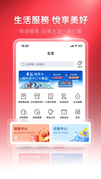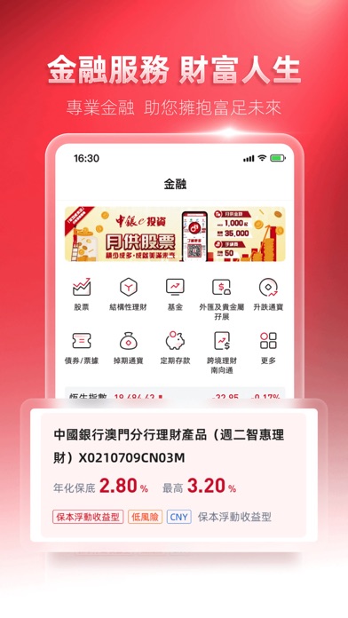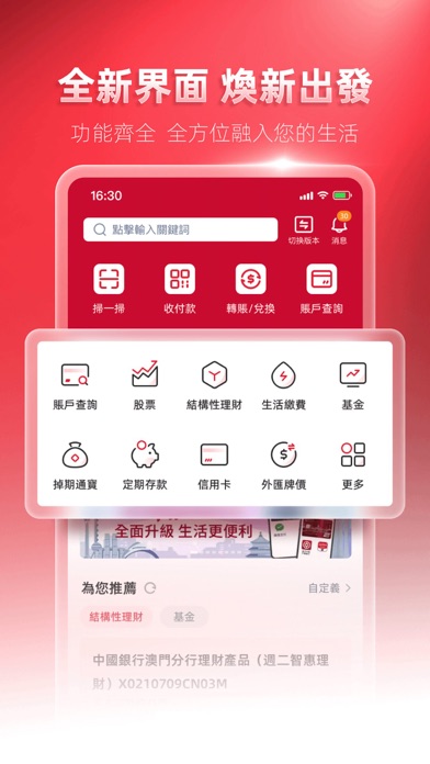 全新澳门中银手机银行隆重登场,接口焕然一新,功能丰富实用,操作方便快捷,系统安全可靠,随时随地满足客户的移动金融需求。互联网金融时代,澳门中银手机银行将给您带来全新的体验: - 中银卡立即注册:您可凭中银卡立即开通中银e网(个人)及澳门中银手机银行,享受手机扫码支付及理财的全新体验。(中银e网(个人)用户可直接登录) - 移动支付 玩转精彩生活:中银智慧付、二维码收款、AA收款、手机号转账、好友转账,多种收付款方式供您选择。 -红包:手机都可以发红包啦!过年过节,无论您身处天涯海角,都可以用手机收发红包啦,仲唔快d发返个红包俾亲朋好友。传情达意,尽在红包。 - 扫一扫 轻松缴费:缴费唔使再慢慢入单号又怕入错啦,只要扫一扫单号上面个二维码就可以轻松缴费。 - 电子政务:提供财政局、卫生局、交通事务局、公报、民政总署、地图绘制暨地籍局、经济局网站快速入口,助您掌握澳门城中大小事。 - 在线开户:开户要等好耐?攞卡又要走多转?澳门中银手机银行提供在线开户功能,可在线同时开立储蓄存款账户、定期存款账户及金融投资账户,助您节省时间。 - 我的优惠券:系指定优惠活动中使用中银智能付比钱攞到优惠券,着数跟您随身走。 - 吉祥金:上网都可以订购吉祥金啦,到货仲有专人通知。各种特色纪念金既可投资保值,又有收藏价值,仲唔快d订返套。 - 基金:中银为您挑选多款焦点基金,更提供专业级基金数据及图表,助您把握基金市况。 - 结构性理财:保本理财,收益稳定,好过做定期啦! -信用卡专区:海外磁条设置、申请信用卡、信用卡还款等,集信用卡功能于一身。 -旅游保险:出门旅游前,用澳门中银手机银行购买旅游保险,快捷又安心。 -在线取号:办理业务前先在澳门中银手机银行上取号,告别排队等候 -分享收款二维码:可通过微信、WhatsApp及Facebook Messenger分享收款二维码 澳门中银手机银行将不时更新,令服务及功能更加全面,敬请密切留意。修复已知问题及优化体验