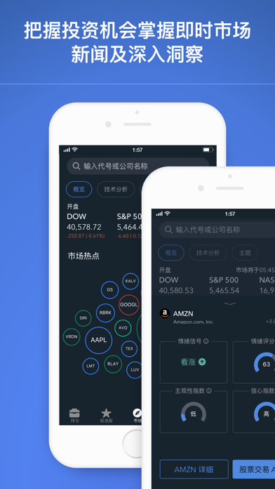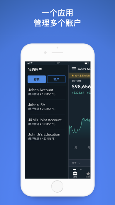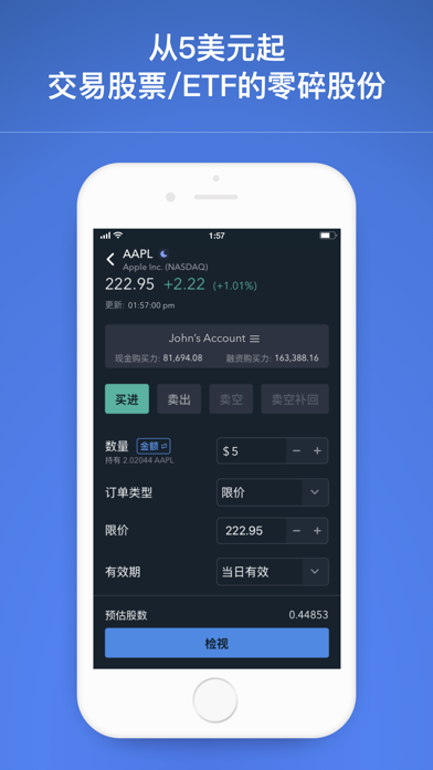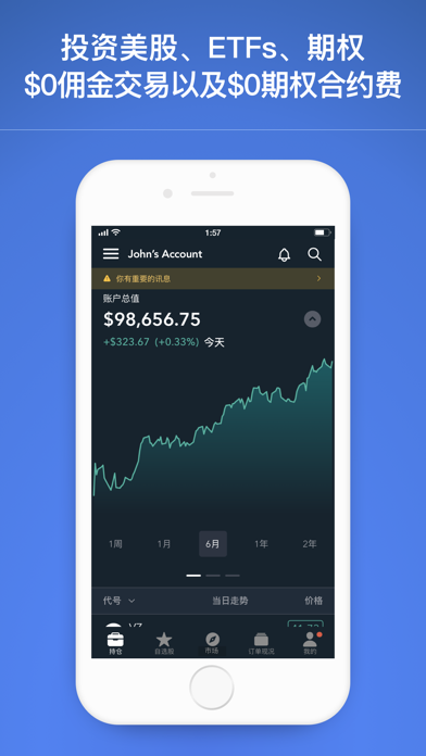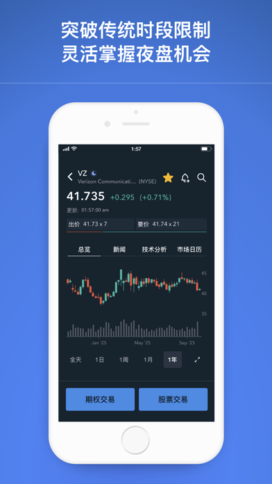 【一个平台,无限机会】 Firstrade提供您需要的所有美股投资产品——投资股票/ETF及期权。开设个人投资账户以投资多种资产类型。支持中英双语交易平台。 【3分钟开户,体验完全零佣金交易】 - $0 佣金交易股票/ETF、期权和共同基金 - $0期权合约费用 - 没有最低存款要求,没有账户闲置费用 【交易更智能、更快捷】 - 零碎股交易仅需5美元起,就能投资您最喜欢的公司股票。 - 实时报价、企业信息、历史图表以及即时新闻 - 通过市场动态(Market Buzz)获取情绪分析,包括情绪评分和信号。访问股票详细信息、绩效分析,并直接通过新增的“技术分析”功能进行交易。 - 使用Technical Insight®快速识别趋势和模式,提供“最热门股票”、“当前趋势”、“查看最多的看涨事件”和“查看最多的看跌事件”等列表。可通过总览和市场页面访问股票分析。 - 探索并投资按主题分类的股票,如5G、自动驾驶、国防、ESG等。 - 使用滚动期权功能,让期权交易更明智。 - 查看期权关键指标一目了然:最大收益、盈亏平衡、最大亏损、希腊值和隐含波动率。 - 高级图表可以转换为横向模式并带有多项技术分析指标以准确追踪个股走势。 - 通过晨星和Trading Central 提供的优质研究发现投资机会,并配以即时新闻更新。 灵活掌握延长时段与夜盘交易,突破常规交易时间限制 盘前+当日+盘后(延长时段):美东时间上午 8点 至晚上 8 点 夜盘交易时段:美东时间晚上 8 点至第二天 凌晨 4 点 (周日至周五) - 适用于手机装置、iPad 和网路平台。 【安全可靠的优质券商】 - 我们专业的中英文客服人员将随时准备通过电话和电子邮件为您提供帮助。 - Firstrade Securities Inc. 自 1985 年以来一直是SEC(美国证券交易委员会)、SIPC (证券投资者保护公司) 和FINRA (美国金融业监管局) 的成员。 - 账户中的证券由 SIPC 承保高达 500,000 美元(包括 250,000 美元的现金索赔)。 公开声明 Firstrade通过移动应用程序及网络平台提供股票, ETFs,期权和共同基金的免佣金交易。相关的SEC(美国证券交易委员会)和FINRA或其他费用可能仍然适用。有关详情,请参阅Firstrade交易收费页面 https://www.firstrade.com/zh-CN/trading/pricing 。 Firstrade App中的任何内容均不应被视为买卖证券、期权或其他投资产品的推荐或招揽,所有信息仅供参考。 Firstrade (FINRA / SIPC成员) 所提供的证券产品和服务不受FDIC保险,并且存在投资风险,包括可能会损失投资的本金。 系统作业与市场接收状况可能因各种因素而异,包括交易量,市场条件,系统性能和其他因素。-提高了应用程式的整体稳定性。