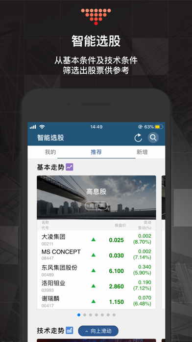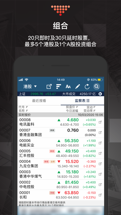 投资者必备 - 经济通 股票强化版MQ (手机) - 全新介面设计 财经信息更丰富,操作更简易 - ”大市概览”界面 可在同一版面概览领涨领跌行业、各地重要指数、沪港通-每日余额、异动股新闻、热炒股票及新股上市,助您尽快掌握市况 【内容及功能重点】 - 免费实时报价 港股、A股、期指及夜市报价 -互动实时图表 包括证券、指数和期货的即市及历史走势图,用户可自由移动及放大 - 自定义实时投资组合 可自定义多个港股及A股的投资组合 - 经济通财经新闻及评论 名家评论、大手异动、大行报告、市场传闻及外围经济等,更新增“收藏”及“分享”文章功能 - 各地指数、外汇及商品报价、AH股比较等、双币双股、海外预托证券报价、交易所买卖基金(ETF) - 重要信息推送通知(重点新闻、新股上市)、配合到价提示 (必须登入) # 用户可于登入后查看串流报价。 ## 根据香港交易所条例,使用串流报价必须为登记用户。 App内购买 使用条款:http://www.etnet.com.hk/www/tc/product/terms.php?app=mq 私隐政策:http://www.etnet.com.hk/www/tc/product/terms.php?app=mq#privacy修复已知问题,进一步提升稳定性与使用体验