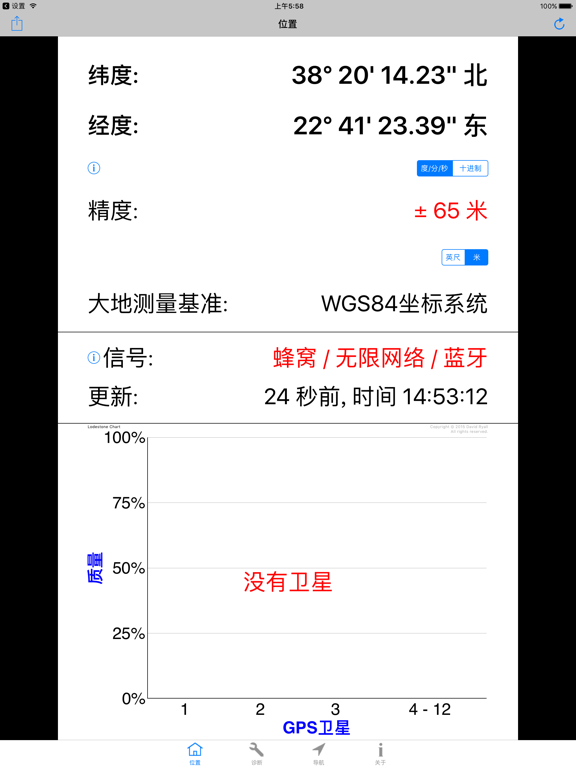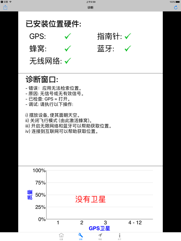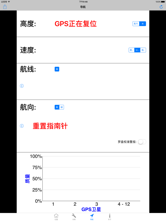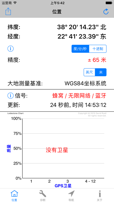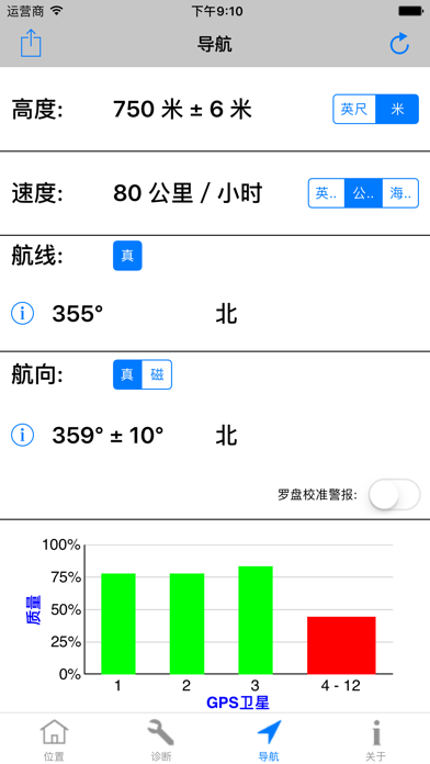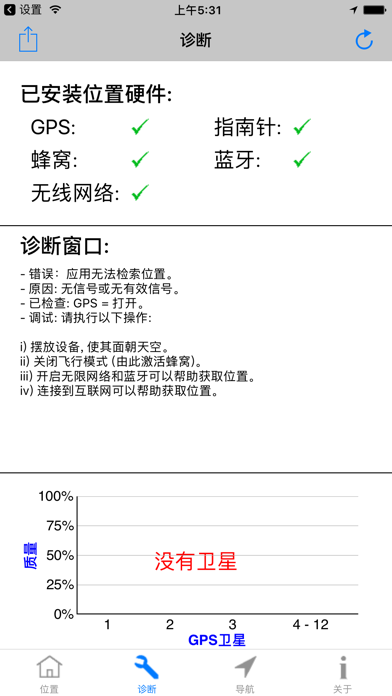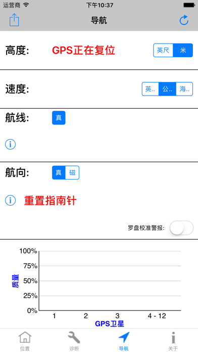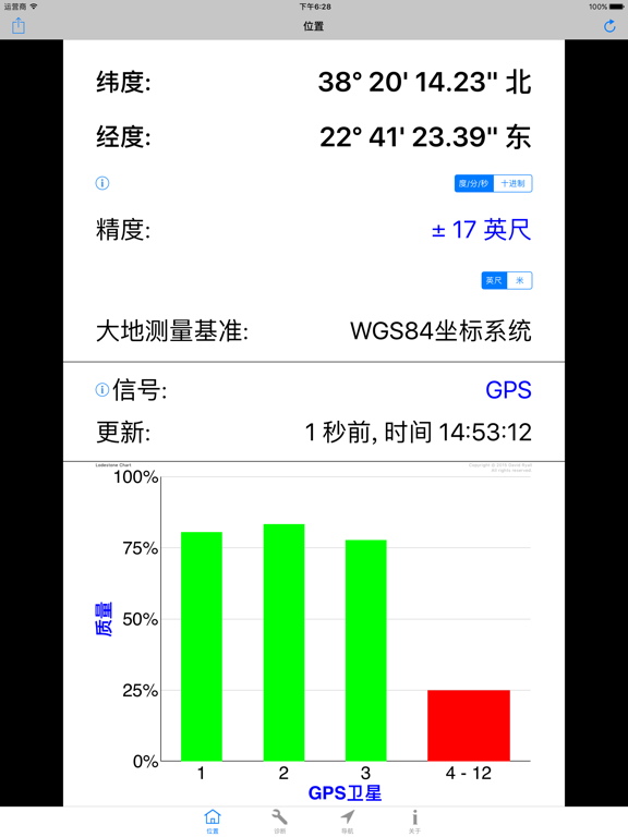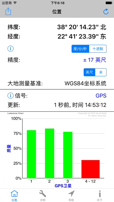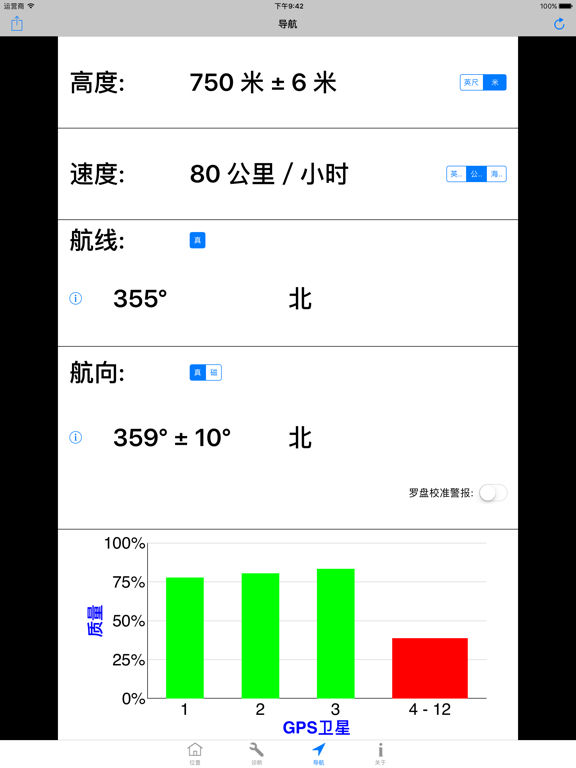 主要特征和优点: -适用于iPhone和iPad的必备工具。 -测试GPS模块。 -最快的GPS锁定时间。 -精确的导航参数。 -补充您的导航应用程序的操作。 -GPS“快速启动”技 -如果无法确定位置,则诊断原因。 -协助您改变条件以获得可靠的位置。 -GPS,伽利略,GLONASS,QZSS全面支持。 -纬度和经度,默认情况下包括WGS84。 -通过电子邮件免费提供技术支持。 ------------------------------------ 概述: -Lodestone Chart™(图表): 使用只有4条的图表显示所有基本的GPS卫星信息。这极大地简化了诊断过程(注册版权)。 -GPS“快速启动”技术可以解决导航应用程序的GPS问题,这些应用程序的位置冻结,响应速度慢或执行不正确。 -使用iPhone或iPad的内置GPS。 -包括车速表,高度计和指南针。 -位置和高度(一流的准确性和可靠性) -速度(SOG)和路线(COG)。 -具有开启和关闭手动罗盘校准功能的航向(即罗盘)。 ------------------------------------- App 内购买项目 = 专业人员座标(仅限英语) 这会在应用程序中添加其他坐标系和基准,使您可以准确地使用平民,美军和北约部队用于步行,航行和飞行的许多纸质地图和图表。所包含的坐标系和基准为: 美利坚合众国的国家网格 (USNG) 军事网格参考系统 (MGRS) 通用横轴墨卡托(UTM) 英国国家电网 (OSNG) 世界地理参考系统 (GEOREF) 全球区域参考系统 (GARS) -174个基准(例如WGS84,NAD83,NAD27,WGS72,ED50,ED79,OSGB36等...)。 -------------------------------------- 评论: -开发人员是从事卫星航天业的专业软件和硬件工程师。他是一位游艇驾驶员和飞行员,对导航和Apple产品充满热情。 -一致的5星评价,查看用户在说什么: “完美的诊断工具-如果您需要了解内部GPS的实际状态,这是最好的应用程序。” “出色的启动导航应用程序的应用程序-该应用程序每次都会找到位置,然后所有其他导航应用程序都可以工作。” “出色的应用程序-这是iOS设备急需的应用程序。” “太棒了,用完了,但是这个应用程序是-这个应用程序可以完成其他开发人员无法做到的事情。” -------------------------------------- 更多信息: -硬件信息 -为专业用户显示的测量精度。 -英制,公制和航海单位。这些是最常用和最有用的导航单元。所有这些都可以从使用中的屏幕轻松更改。 -不需要互联网访问,也不使用手机数据。 -任何高级用户的必备工具。 (例如,导航员,游艇驾驶员,飞行员,应用开发者) -通过短信,电子邮件等分享您的位置。该格式包含所有基本信息,以提高准确性。 -与Garmin Glo合作。 -GPS Diagnostic™是适用于iPhone和iPad的专业GPS测试和测量实用程序。文件大小减少80%至35MB。 完全支持最新的iPad Pro型号。