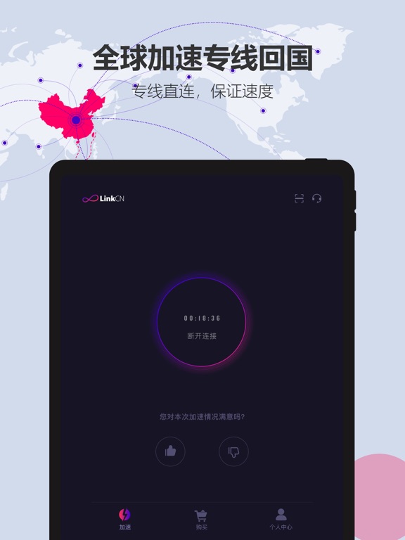 LinkCN是一款专为海外华人、留学生、海外出差用户群体开发的回国加速器。高速专线,一键加速,海外回国无障碍,免费畅连国内资源,极速稳定延迟低。听音乐、影视追剧、看直播、玩网游、商务办公......全生活场景,LinkCN都能满足。 *友情提示:LinkCN为海外回国专用加速器,无法为位于中国大陆地区的用户提供服务。 LinkCN支持国内全平台: 【国服游戏】王者荣耀,和平精英,剑与远征,英雄联盟,荒野行动,绝地求生,一拳超人,魔兽世界,DNF,穿越火线,剑网3…… 【国内音乐】网易云音乐,QQ音乐,酷狗音乐,虾米音乐,酷我音乐,咪咕音乐,全民K歌…… 【国内视频】优酷,爱奇艺,腾讯,芒果TV,Bilibili,抖音,快手,火山小视频…… 【国内直播】虎牙直播,斗鱼TV,企鹅电竞,腾讯体育,PP体育,CCTV5…… 【其他场景】逛淘宝、刷微博、百度&高德地图导航、看股票、商务办公等多场景同样支持。 如果有新的平台需要支持,请及时反馈,我们的团队会尽快解决您的问题! LinkCN的优势: 【专业】十余年加速器开发经验,业内技术领先。 【口碑】多年品牌,服务保证,百万海外游子选择。 【稳定】优质服务器,全球专线,极速稳定。 【便捷】极简UI,一键加速,游戏音乐视频同时畅享。 【共享】一次购买,多台设备可同时享受在线加速。 【保障】会员购买,七天内无条件退款。 【安心】邮件、公众号、Livechat多途径,专业客服支持。 如有其他任何问题可以在【官网】或【客户端】内【个人中心】-【联系客服】进行反馈,或通过以下方式反馈: 邮箱:support@51linkcn.com 微信公众号:LinkCN加速器 【自动续费套餐说明】 - 订阅周期:7天,1个月,3个月 - 订阅价格:以应用内套餐价格为准。 - 付款:用户确认购买并付款后记入iTunes账户。 - 取消续订:如需取消续订,请在当前订阅周期到期前24小时以前,手动在iTunes/Apple ID设置管理中关闭自动续订功能。 - 续订:苹果iTunes账户会在到期前24小时内扣费,扣费成功后订阅周期顺延一个订阅周期。 - 隐私政策:www.51linkcn.net/privacy-policy/linkcn.html - 服务协议:www.51linkcn.net/terms-of-use/terms-of-use.html - 自动续费会员服务协议:www.51linkcn.net/autorenewagreement.html1. 优化用户加速后的网络效果 2. 提升用户加速体验