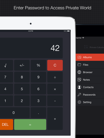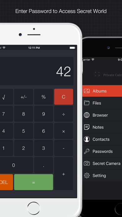 私人计算器可以把你不想被人看到的图片/视频/文档/记事本/联系人等隐藏在计算器背后,在别人看起来只是一个普通的计算器,不用担心被人发现,你只需要在计算器输入预设的密码,即可进入你的私人空间,方便快捷。 主要特性: 私人相册: - 图片墙预览 - 从相册导入图片与视频 - 自定义缩略图大小 - 强大的图片浏览器 - 幻灯片播放功能 私人文件管理器: - 通过无线WiFi传送文件,操作方便快捷 - 通过USB连接iTunes传送文件,传送速度快 - 支持所有常见音视频,如.avi, .wmv, .mkv, .flv, .mov, .mp3, .mp4, .m4v等 - 支持常见文档格式,如.txt, .html, .pdf, .doc等 - 支持常见图片格式,如.jpg, .png, .gif, .bmp等 - 文件夹分类,便于整理内容 - 解压缩文件 - 通过邮件或其他APP分享文件 私人浏览器: - 完整功能的私人浏览器 - 书签/历史记录管理 - 快速下载页面所有图片 - 自由切换iPhone/iPad/桌面电脑模式 - 无限制下载任意文件 - 实时下载进度/速度显示 - 全屏浏览 私人记事本: - 无限制添加记事 - 富文本编辑 - 自定义字体 - 复制/分享/邮件记事 私人通讯录: - 无限制添加联系人 - 从手机导入联系人 - 为联系人添加备忘录 - 快速拨号/发送短信/发送邮件 密码记录器: - 无限记录各产品用户名密码 - 密码安全加密保存 私密相机: - 在计算器界面直接隐秘地拍照 更多特性: - 简洁快速的计算器 - APP切换到后台时自动回到计算器界面 - 摇一摇解锁 — 输入密码后摇一摇设备进入文件夹,避免其他人误输入密码 - 指纹解锁 - 快速锁定 — 盖住手机听筒快速返回计算器界面 - 伪装密码 — 设置另一个密码进入伪装的另一个空间 - 本应用在主屏幕显示的应用名是"我的计算器"Apple 已更新此 App 以显示 Apple Watch App 图标。 新特性: 1.私密相机:可以在计算器界面隐秘地拍照 2.快速锁定:通过盖住手机听筒快速返回计算器界面 3.记事本富文本编辑:支持各种富文本格式,包括颜色/列表/加粗/居中/链接等 4.浏览器支持全屏浏览 Bug修复: 1.修复伪装模式有时能看到记事本内容的问题 2.修复在浏览器输入内容时位置乱跳的问题