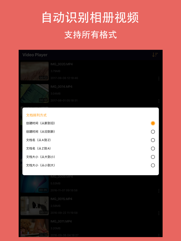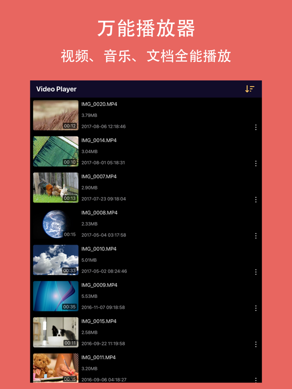 高清万能视频播放器 - 欣赏影片的最佳选择。 高清万能视频播放器是最流行、最简单、支持格式最多、功能最强大的视频播放器之一,完全支持存储在手机里的视频摄像、电影、电视剧以及音乐、MTV。 主要的功能特点: a)自动识别手机上的所有视频 b)高清、流畅的播放视频文件 c) 硬件解码 - 拥有最新的硬件解码器,更多视频能受益于硬件加速。 d) 通过itunes、wifi将电脑上的视频传输到手机上。也可以通过wifi把另一台手机上的视频传输到你的手机上。 e) 界面锁 -锁定界面,能够防止看视频的时候误操作,让你更好的享受享受视频 f)流畅播放FLV文件,无需安装Flash Player插件; g) 删除视频功能 文件格式: AIFF、AMR、AMV、ASF、AU、AVC、AVI、AVS Video、BDAV、CDXA/MPEG-PS、DV、FLAC、Flash Video、GXF、IVF、k3g1、kddi、LXF、Matroska、MIDI、MLP、mobi、Monkey's Audio、MPEG Audio、MPEG Video、MPEG-4、MPEG-4 Visual、MPEG-PS、MPEG-TS、mqt、Musepack SV7、Musepack SV8、MXF、OGG、QuickTime、RealMedia、Shorten、SKM、TTA、TwinVQ、VC-1、Wave、Wave64、WavPack、WebM、Windows Media 视频格式 601P、AMV Video、AVC、AVS Video、avs2、Cinepack、Dirac、DV、FLC、FLI、H.263、H.264、Indeo 4、JPEG、mp4v、MPEG-1 video、MPEG-2 video、MPEG-4 AVC、MPEG-4 part 2、MPEG-4 part 10、MPEG-4 Visual、On2 VP3、On2 VP5、On2 VP6、On2 VP7、On2 VP8、MTS2、QCELP/PureVoice、raw video、RealVideo 2、RealVideo 3、RealVideo 4、Sorenson 3、Theora、tiff、TrueMotion S、VC-1、VC-3、VDOWave、WMV2 音频格式 AAC、AAC LATM、ACELP、ADPCM IMA WAV、ADPCM EA R2、AMR、Cooker、COOK、DCA、EVRC、FLAC、GSM 6.10、MIDI、MLP、Monkey's Audio、MP2 Audio、MP3、Musepack SV7、Musepack SV8、PCM、QCELP、Qdesign 2、Shorten、sqcp、TTA、VQF TwinVQ、Vorbis、Voxware、VP6、WavPack、WMA 字幕格式: SubRip(*.srt),SSA/ASS(*.ssa,*.ass)1.功能细节优化 2.提升整体使用体验