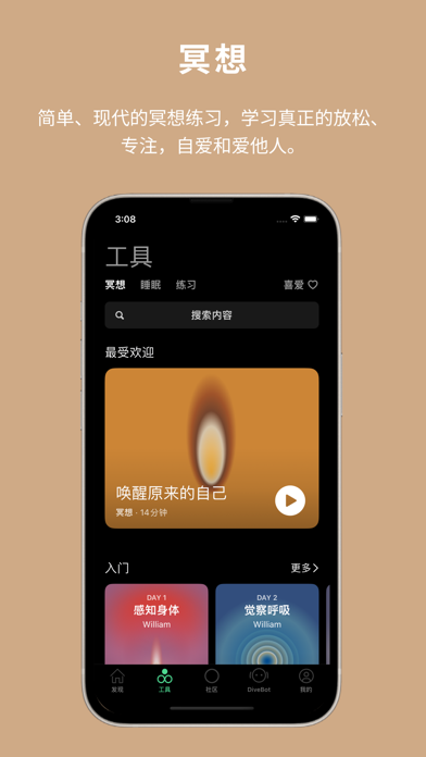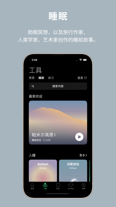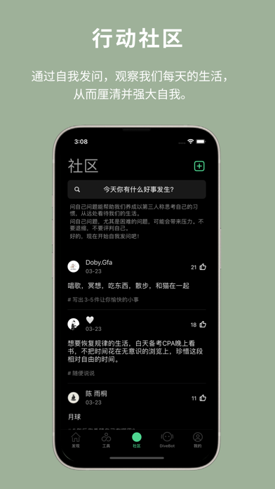 Dive Health是一个关注身心健康的自助工具APP,Dive的工具包括: • 专属机器人DiveBot,帮助你自我理解和实现,解答你在自我认知、个人成长、职业发展、人际关系、情绪健康等各种人生课题上遇到的困惑,支持并深化你的心智成长。 • 简单、现代的冥想练习,帮助你学习真正的放松、专注,自爱和爱他人。练习方法多样,时长5-20分钟不等,对新手和长期习练者都适用。你可以在任何你想要暂停的时候使用它们。 • 助眠冥想,以及由旅行作家、建筑学者、艺术家等为你创作的睡前故事,希望帮助你平静入睡。 • 行动社区,萨特说,to be is to do,存在即行动。行动社区希望你通过自我发问、对话以及一系列探索生活的练习,观察并创造我们每天的生活,从而厘清并强大自我。 【健康数据集成】 本应用可以与Apple健康 (Health) 应用集成,记录包括正念分钟数在内的健康数据。 【Dive+会员】 Dive+用户可获得深入洞察报告和个性化建议。您可以通过Apple订阅Dive+会员。 • 会员价格:15元/月 • 购买连续包月会员的账号,会在每个月到期前24小时,自动在iTunes账户扣费并延长1个月会员有效期。 • 如需取消订阅,请打开苹果手机“设置”-->进入“iTunes Store与App Store”-->点击“Apple ID”,选择“查看Apple ID”,进入“账户设置”页面,点击“订阅”,选择Dive+会员取消订阅即可。如未在订阅期结束的至少24小时前关闭订阅,此订阅将会自动续订。 • 本应用购买遵循Apple标准最终用户许可协议:https://www.apple.com/legal/internet-services/itunes/dev/stdeula/ • 有关隐私保护的额外说明,请查阅:https://www.d18s.cn/about-privacy/体验改进及问题修复。