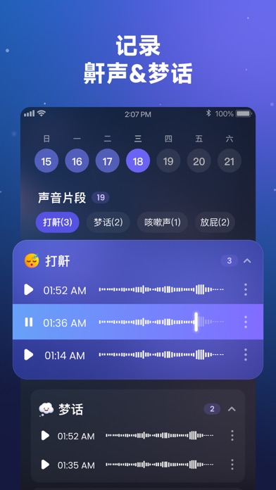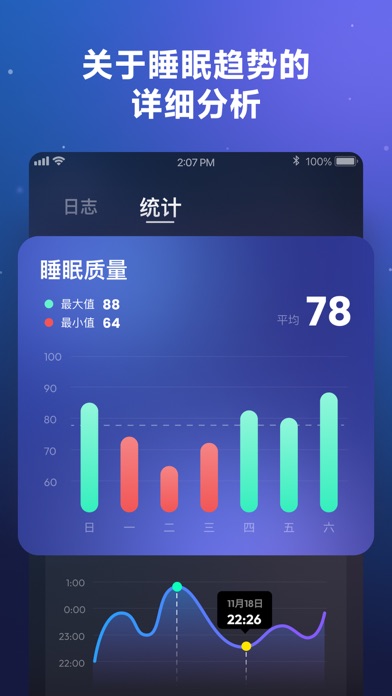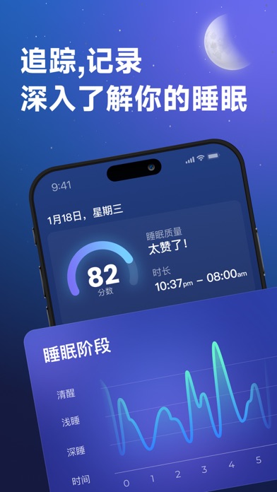 你知道自己每晚的睡眠情况吗? 睡眠追踪器是一款全面的个人睡眠监测工具,能够记录你的睡眠数据,追踪鼾声和梦话,并提供助眠的白噪音和深度睡眠音乐。通过这款应用,你可以详细了解自己的睡眠规律,缓解失眠问题,还可以通过自定义智能闹钟和起床提醒改善睡眠质量。快来下载吧,帮助你提高熟睡时间,拥有更健康的生活! 睡眠追踪器的7项功能: √ 了解睡眠深度和周期 √ 探索每周和每月睡眠趋势 √ 记录和回听鼾声或梦话 √ 倾听助眠音来放松自我 √ 享受智能闹钟温柔唤醒 √ 记录睡眠笔记和醒来心情 √ 同步数据到Apple Health 推荐下载的主要理由: √ 白天感到非常劳累却找不到原因? √ 饱受失眠之苦,希望睡觉时不再满脑子的胡思乱想? √ 希望早上醒来不再昏昏沉沉,保持最佳状态? √ 想知道什么时候入睡,什么时候从深度睡眠中被吵醒? √ 正在寻找昂贵睡眠追踪设备的替代品? √ 好奇睡觉时的鼾声、轻声梦话或其他声音? 以上这些,睡眠追踪器通通可以帮你解决,并为你带来你值得拥有的更高效的生活。 精心设计的功能: 查看睡眠周期记录 你的夜间睡眠质量如何?通过查看每日、每周和每月的睡眠报告,就可以轻松追踪你的睡眠。无需将手机放在枕头下,将设备放在附近就可以了。 聆听夜晚的声音 你是否好奇晚上会不会打鼾或说梦话?在这里你可以获取夜间录音,还可以与朋友分享这些有趣的录音。 助眠音帮你轻松入睡 只需选择聆听一段舒缓的声音,就可以放松神经,缓解压力,更快入睡。 自定义智能闹钟 起床后昏昏沉沉?自定义智能闹钟,就可以在浅睡眠阶段被温柔唤醒。多款起床铃声可供选择,让你醒来神清气爽、精力充沛。 记录睡眠笔记和醒来心情 你是否注意到一些睡前习惯会导致失眠或使醒来的情绪变得更糟?那就开始记录睡眠笔记和起床心情来帮助你捕捉那些危险信号吧。 现在就下载睡眠追踪器来解决你所有的睡眠问题吧。有了它,你也可以睡得香甜安稳,醒来神清气爽。睡得好,生活更美好。 会员说明 - 无限制地访问所有功能,订阅价格,¥128.00/年 - 订阅费用将从您的iTunes账户收取。 - 订阅到期前的24小时内将自动续订。如有需要,请于订阅到期的至少24小时之前取消订阅。 - 订阅后,您可以在iTunes的“账户设置”中管理您订阅的项目,也可在此菜单中取消订阅。 - 订阅后,免费试用期内的未使用部分将被作废。 隐私政策:https://sleep.leaphealth.fitness/privacypolicy.html 使用条款:https://sleep.leaphealth.fitness/terms.html- 我们优化了睡眠质量分数,帮助你更好地了解休息与恢复情况。 - 修复了一些问题,让体验更流畅。