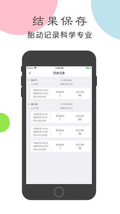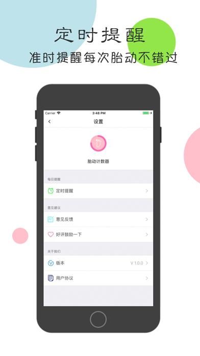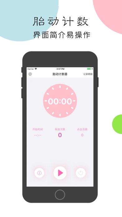 【产品简介】 胎动计数器, 一款怀孕妈妈必备的数胎动工具. 界面简约可爱,为您提供贴心的数胎动的功能, 还具有胎动的历史数据统计、呈现等功能, 为您掌握宝宝胎动规律, 确保胎儿健康成长提供有利的帮助. 【产品特点】 ● 界面温馨简介 ● 操作顺手流畅 ● 数据保存本地 【什么是胎动】 胎动是胎儿在子宫腔里的活动冲击到子宫壁的动作. 胎儿在子宫内伸手、踢腿、冲击子宫壁, 这就是胎动. 【胎动的类型】 孕妈妈能感觉到的胎动,最初出现在下腹中部,常有几种不同的类型。 1.妊娠早期的胎动 超声所见到的妊娠早期胎动有几种不同的类型,妊娠7~8周时,可见到胚芽有轻微的波纹状运动;9周左右出现小的抽动;9周后更明显;9~10周之间可见到较强的抽动;10周以后则出现飘动、浮动及跳动等较强的运动。 2.妊娠中期以后的胎动 类型更多,如惊跳、全身运动、孤立的上肢或下肢运动、屈伸头部、转头、转身、伸展、张口、手触脸部及打呃、打哈欠、吸吮、吞咽等。这些运动,在妊娠13~15周达最高峰,17周后逐渐减少。 3.足月后的胎动 接近足月后,尤其是38周以后,较大幅度的全身运动更少,仅能观察到眼的运动、张口、手的活动及呼吸运动等。 【胎动的感觉】 每个孕妈感觉到的胎动都是不一样的. 有的孕妈会感觉到有小鱼在肚子里面游泳, 或是像肠胃蠕动一样, 肚子里面“咕咕”作响;有的孕妈会感觉肚子里面, 像有水烧开了一样“咕咚咕咚”地响, 很多搞不清状况的新手妈妈, 会误以为自己喝了太多的水造成的, 却不知道这是宝宝正在运动呢. 等到胎宝宝越来越大的时候, 他的活动也会越来越频繁, 越来越激烈. 等到胎宝宝六七个月之后, 孕妈妈就可以清楚地感受到, 宝宝在用小脚丫踢你啦. 【数胎动的原因】 胎动是临床产前胎儿监护技术中的重要内容之一. 胎动的次数多少、快慢强弱等表示胎儿的安危. 【数胎动的方法】 方法1:怀孕到28周起,准妈妈可以开始数胎动,(建议在晚饭后,因为这段时间胎动较为频繁),采用左侧卧姿势,记录10次胎动所用时间。如果10次胎动在2小时内,可以推测胎动没有异常,如果感觉不到胎动或10次胎动的所用时间大于2小时,应尽快找医生进行下一步检查。 方法2:准妈妈可在早、中、晚各用一小时测量胎动,每小时不少于3次。3小时的胎动总和乘以4,结果不少于30次,如少于10次应该立即就医。 【最最最重要的】 预祝孕妈妈生产顺利。◕‿◕。 如有意见或者建议请联系: 邮箱: kity_pei@163.com【修复】修复已知问题。 感谢大家提供的意见建议,后期维护中会添加对应功能。