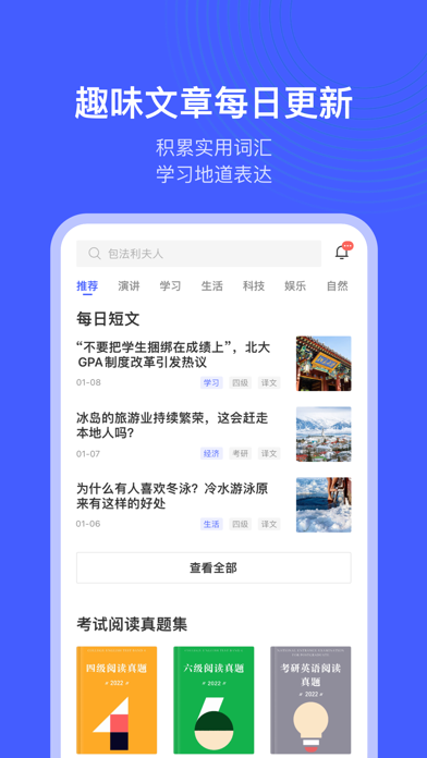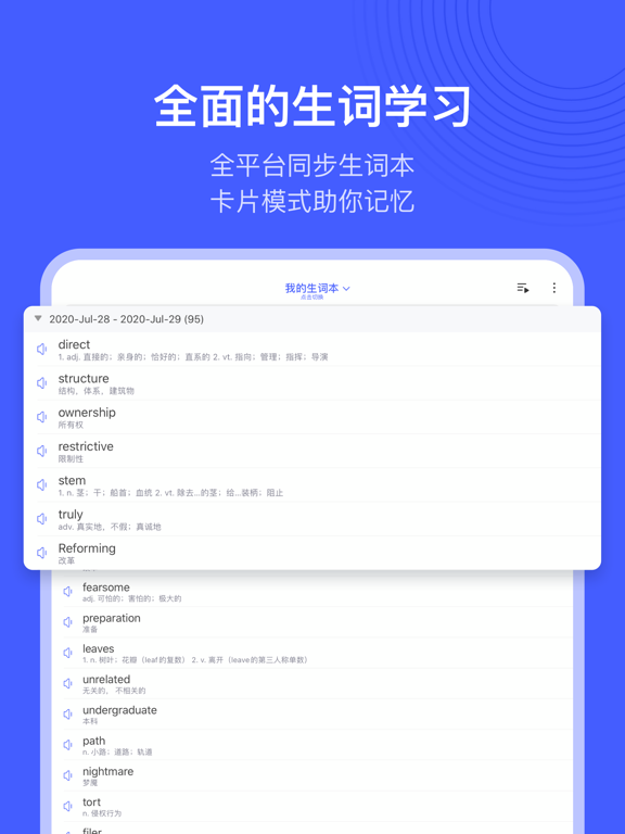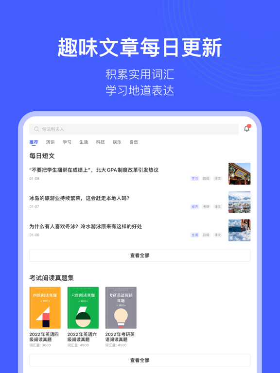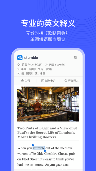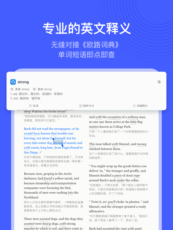 每天10分钟,英语轻松读!专为英语学习者打造的阅读、词汇提升 App。软件会根据你的英文水平,每天推荐精选趣味短文,更有知识点讲义、词汇智能提示、生词本学习等功能,等你来发现。 【趣味文章,每日更新】 精选短文:由编辑精心挑选的英语文章,只需三分钟,轻松积累实用词汇,学习地道鲜活表达; 考试真题:内置四六级、考研阅读真题,中英双语对照、单词即点击译,助你快速把握文章要点; 演讲精选:TED 、乔布斯、名人高校演讲...双语字幕搭配演讲视频,带你了解语言表达的艺术; 精听党:名著原声朗读,高亮双语字幕,结合干货知识点讲义和课后习题巩固,再也不用担心名著读不懂啦。 【每日外刊,深度专业】 选自主流的英美外刊,美国本土外教纯正发音朗读; 专业英语教师逐字逐句精讲,单词、语法、发音知识一网打尽; 每天2-3道练习题和配套答案详解,助你测评当天学习效果。 【强大功能、高效阅读】 单词查询:与《欧路词典》无缝集成,长按查词,即指即译; 播放调节:8档语速调节、4种译文切换,满足不同阶段的学习需求; 智能提示:重点单词、各大考试(四六级、考研、托福GRE雅思等)的高频词,可在文章中自动标注,单词学习更高效; 生词学习:文章中长按即可查词并加入生词本,更有卡片播放等复习模式助你学习; 统计图表:每天的阅读记录都会通过图表生动展示,记录你一点一滴的坚持与努力; 阅读提醒:同学,今天是不是忘记阅读了?不要紧,软件每天都可以按时提醒你。 【文件阅读,即点即查】 您可以导入需要阅读的文献,支持PDF、ePub及docx格式; 阅读时即点即查,省却查词时复制粘贴的烦恼,阅读效率大大提高; 支持添加批注,随时记录你阅读时的所思所想。 【订阅服务说明】 订阅服务:VIP 连续包季(3个月) 订阅价格:以iAP申请信息为准,VIP 包季服务为58元/季度 付款:用户确认购买并付款后计入iTunes账户 苹果iTunes账户会在到期前24小时内扣费,扣费成功后订阅周期顺延一个订阅周期 如需取消订阅,请手动打开苹果手机“设置”->进入“iTunes Store与App Store”->点击“Apple ID”,选择“查看Apple ID”,进入“账户设置”页面,点击“订阅”,取消订阅即可。如未在订阅期结束的至少24小时前关闭订阅,此订阅将自动续订。 自动续费规则:https://www.eudic.net/v4/en/home/service 用户使用协议:https://www.eudic.net/v4/home/serviceterms 隐私协议:https://www.eudic.net/v4/home/privacy- 新增 支持显示段落解析 - 新增 语境解析,长按单词、词组可以查看在上下文语境中的解析