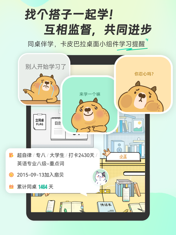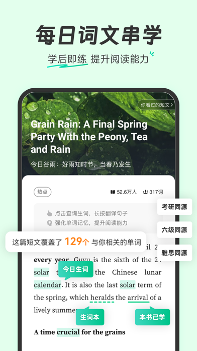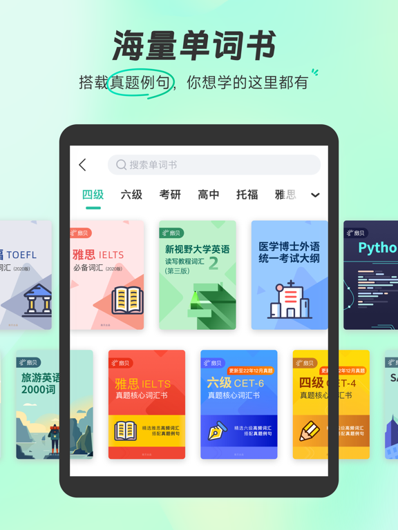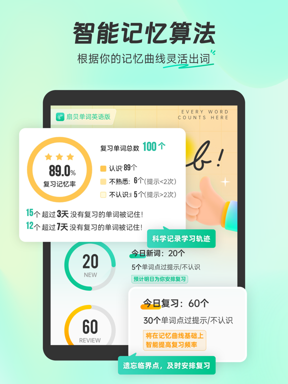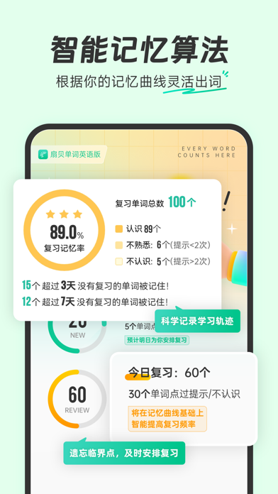 【AI加持 · 更聪明的学习方式】 ▪ 智能精简规划:独家专利技术(ZL 2024 1 1008490.X)智能出词、精简任务,帮助用户筛除可能认识的词,加速背词进程! ▪ 词文串学:AI根据你所学的单词智能生成短文,让用户在真实语境中巩固记忆,告别死记硬背,并支持一键生成学习手帐导出。 ▪ 问问AI:单词反复错?AI实时检测,主动触发谐音、词根等多样助记提醒,还可随时点击魔杖,召唤AI提问哦! ▪ AI短文填词:AI根据指定单词生成首字母填空/选词填空,边学边练,单词记得住、考题做得出。 ▪ 场景背单词:覆盖旅行、工作、学术等多种场景,AI生成实用对话和词汇,即学即用。 ▪ 单词随身听:随时随地收听AI生成的所学单词讲解,把通勤、运动时间都变成黄金学习时间。 ▪ 长难句分析:可上传长难句,AI可一键拆解句子结构、分析成分并翻译。 【专业备考 · 更可靠的学习资源】 ▪ 海量词书:覆盖小学、初中、高中、大学英语四六级(CET-4/6)、考研、雅思(IELTS)、托福(TOEFL)、GRE、GMAT、SAT、BEC等各阶段考试词汇,更包含TED、美剧、医学、计算机、金融等等专业英语特色词书。 ▪ 真题例句:收录历年真实考题,在实战例句中理解单词,精准把握考点。 ▪ 权威词典智慧词根:国内首个引入官方柯林斯词典,为用户提供专业英英释义;更有智慧词根、派生联想,从源头理解单词,成串记忆。 ▪ 多维练习:提供拼写、听写、看中选英、看英选中等多种练习,全方位检验用户的掌握程度。 ▪ 高效备考:内置极简「考研模式」,直达报刊、测评、作文批改等刚需功能;更有「极速刷词」闪卡模式,助你考前快速冲刺。 ▪ 导出词表:一键导出生成单词表,灵活选择词表模版(如艾宾浩斯、单词卡片等),可直接打印或搭配goodnotes等学习工具,实现无纸化背单词,增强单词记忆。 【社区激励 · 更持久的学习动力】 ▪ 组队学习不孤单:找到志同道合的「同桌」,加入学习小组,互相监督鼓励,参与「组队打卡挑战」瓜分奖励或加入「长期战队」和「学习小组」,学习之路不再是一个人。 ▪ 打卡与成就徽章:坚持每日打卡,点亮不断丰富的成就徽章,在满满的仪式感和正反馈中养成好习惯。 ▪ 学习小组件:在桌面提供兼具趣味和仪式感的学习提醒,让每一次解锁手机都成为坚持学习的动力。 点击下载体验更多功能! 联系我们 【小红书官号】:@扇贝英语 【微信公众号】:扇贝单词 【新浪微博】:@扇贝单词APP 【邮箱】:help@shanbay.com 【应用内】扇贝单词英语版APP-「我的」-「帮助与反馈」高考报名进行中! 每背一个单词,就离梦想近一步,全力以赴! 「扇贝AI」+ DeepSeek助记,百亿学习数据,懂英语更懂你! 如果遇到问题或有建议,欢迎点击【我的-帮助与客服】随时召唤我们~