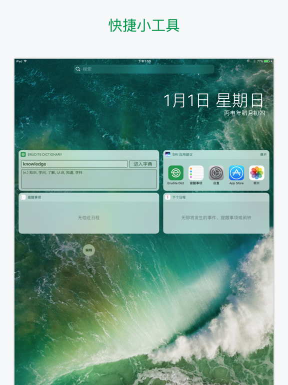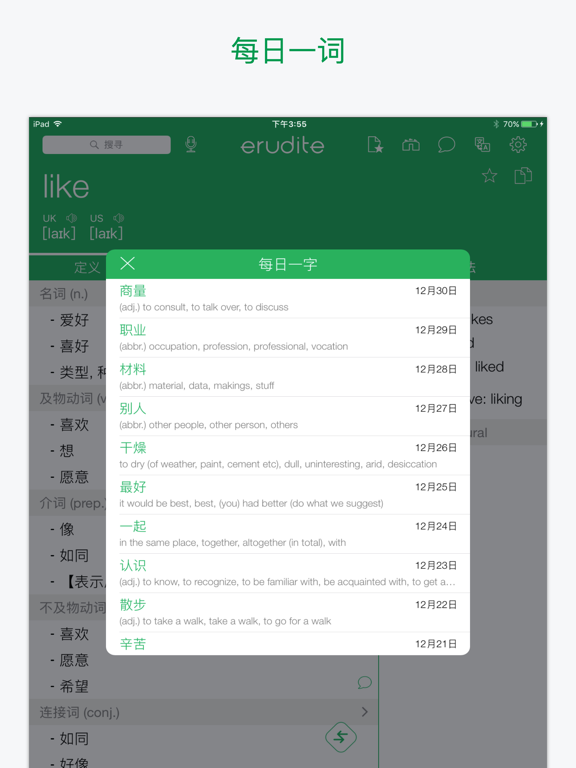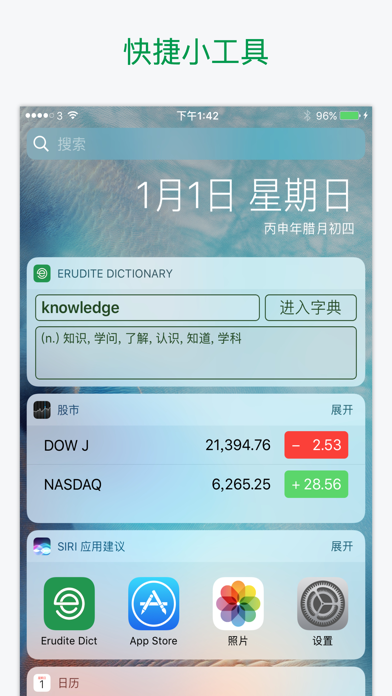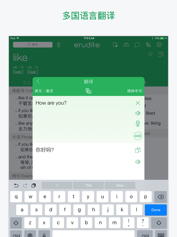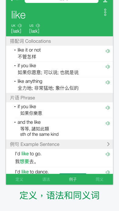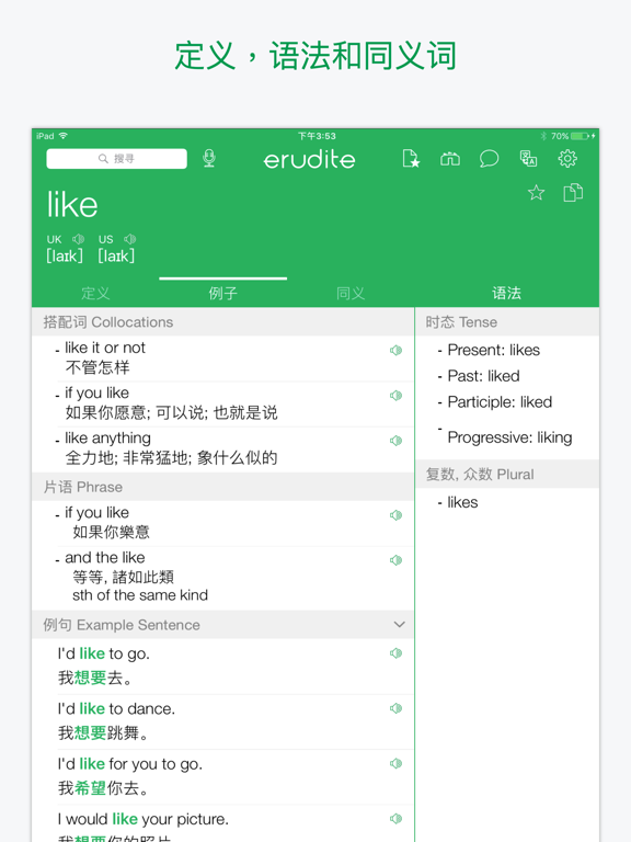本字典提供超过30万英文字的定义、同义词、反义词、语法和使用范例,并支援英式英语、美式英语、普通话和粤语的离线发音,简繁体互换及提供英汉/汉英双向在线翻译。 ===== 本字典的亮点 ===== 1. 超过30万英文字的定义、同义词、反义词、语法和使用范例 2. 标准英中发音 (英式英语、美式英语、普通话和粤语离线发音) 3. 在线翻译 (英汉 / 汉英双向翻译) 4. 每日一字 (每天学习一个新的英文生字!) 5. 书签 (包括我的最爱和搜索记录) 6. 支援繁体中文 / 简体中文 ===== 其他主要功能 ===== 【 翻译器 】- 即时翻译文章 【 抽认卡 】- 轻松学习词汇 【 短语集 】- 集合常用短语 【 小工具 】- 即时搜索生字 【 学习文法并且即时练习 】 【 即将推出更多学习功能 】 ===== 升级至 Premium 的好处 ===== - 没有广告 - VIP电邮支持 - 增加书签数目至1000 - 同步书签到您所有的iOS设备 - 增加每次可翻译的字数 购买成功后,订阅将会自动更新,若在iTunes账户里关闭自动订阅,请至少在支付日期前24小时操作。 隐私政策:https://www.erudite.cc/privacy-policy/ 使用条款:https://www.apple.com/legal/internet-services/itunes/dev/stdeula/ ===== Subscription terms (English version) ===== Once purchased the subscription services: - Payment will be charged to iTunes Account at confirmation of purchase - Subscription automatically renews unless auto-renew is turned off at least 24-hours before the end of the current period - Account will be charged for renewal within 24-hours prior to the end of the current period, and identify the cost of the renewal - Subscriptions may be managed by the user and auto-renewal may be turned off by going to the user's Account Settings after purchase - Any unused portion of a free trial period, if offered, will be forfeited when the user purchases a subscription to that publication, where applicable- 改善稳定性和性能 - 修复了用户报告的问题