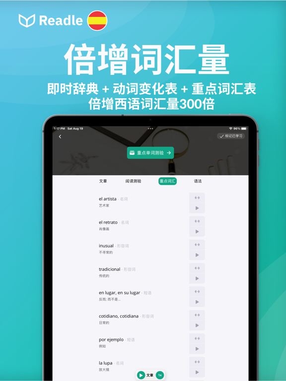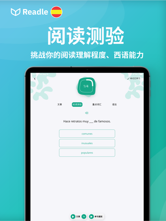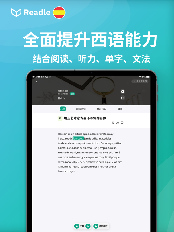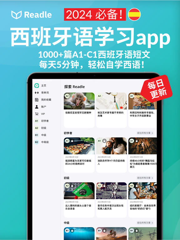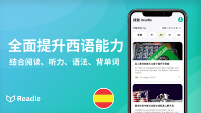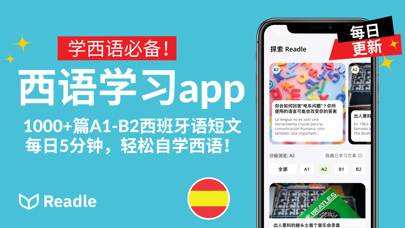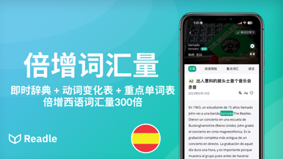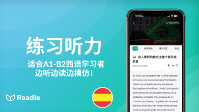 Readle「每日五分钟-西班牙语学习」 免费下载独特的西班牙语学习App 软件,轻松学西班牙语!选择适合你的西班牙语水平的初级到高级 A1, A2, B1, B2 西班牙语新闻文章阅读,配上真人朗读、中西词典翻译与西班牙语文法解说,全面提升你的西班牙语能力,流利说西班牙语! 轻松阅读的起步,简单自学西班牙语 首先选择你的西班牙语水平,挑选你喜欢的主题,每天透过持续的阅读与听力练习,从文章中学习新的西班牙语单词,加上重点语法解说、即时西班牙语词典的帮助,帮助你轻松提升西班牙语阅读与听力能力。 不论你是初学者 A1, A2 或是进阶西班牙语 B1, B2 学习人士 ,都有相对应的文章帮助你学习。 日常生活、职场商务、DELE、SIELE、CELU、CELA或是要到西班牙等西语系国家留学,Readle 是你最佳的西班牙语学习助手! 【 量身打造的西班牙语内容 】 - 文章标示适合的西班牙语水平,帮助你理解及适应语言,增强语感。 【 西班牙语真人发音 】 - 文章搭配法语母语人士录音,让你边读边听,增强听力理解能力。 【 即时西班牙语词典 】 - 即点即查的西班牙语 - 中文词典、单词发音、动词变化,轻松取代其他西班牙语词典或翻译工具(Linguee, RAE/DLE, google translate, deepl, SpanishDict 等),帮助你快速理解文章内容。 【 西班牙语语法解说 】 - 超过170则以上详尽语法解说,让你快速掌握语法。 【 重点西班牙语单词 】 - 重点单字整理加上发音,让你轻松背单词、增加西班牙语词汇量。 【 阅读测验】 - 包含文法、单字测验,挑战你的西班牙语理解功能。 【 丰富内容 】 内建1000篇以上内容主题文章故事,让你直接开始学习! ・旅行与文化 ・西班牙语新闻 (Las noticias de EL PAÍS, Cinco continentes, El Mundo, abc español, bbc español, cnn español) ・美食 ・娱乐 ・运动 ・科学 ・计算机 ・医学 ・其他 西班牙语系国家留学旅游、生活必备,同时也是你自学西班牙语、检定考试最好的助手! ・反馈问题:support@readle-app.com ・隐私政策:https://readle-app.com/privacy-policy/ ・使用条款:https://readle-app.com/term-of-use/ 立即下载试用我们的App吧! 帮我们评分并撰写评论 我们会努力增加内容与更新 Let's learn Spanish together!西班牙语 Readle 最新更新来了: - 优化 app 效能 立即升级 VIP 会员,轻松阅读所有优质学习内容! 有任何问题吗?欢迎写信到 support@readle-app.com 与我们联系