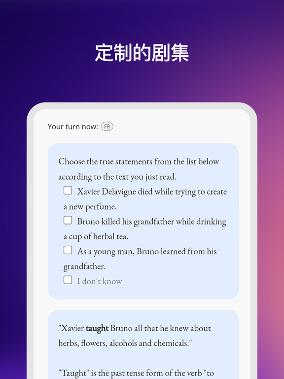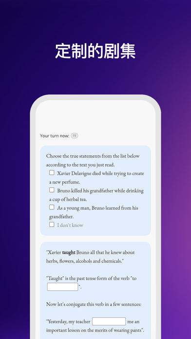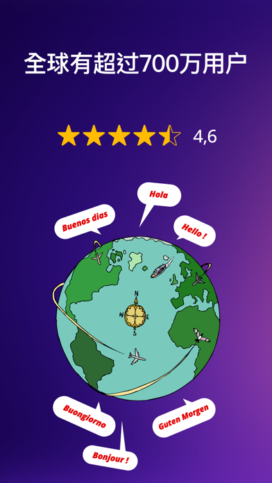 通过我们的 Learning Series 系列,学习一门新语言:英语、意大利语、西班牙语、德语和法语。 全球已有超过 700 万用户! Gymglish 的学习秘方 - 我们的 Learning Series和它一系列有趣而幽默的故事 - 日常身处荒谬情境中的古怪角色 - 适应您水平的剧集、题目、复习和错题解释等。 - 每天10 分钟的时间即可,用于精准且规律的学习 - 数以百计的课程 - 每节课都包含一些所学语言的文化知识 - 7 天免费试用我们的语言课程 个性化课程 - 提供 5 种语言课程 - 选择您的兴趣和目标:商务、旅行、科学、日常生活等 - 每种语言都有专属的文化环境:英语、西班牙语、意大利语、德语和法语 - 根据选择的语言有不同的口音 - 个人或职场生活中的日常情境 一集课程都包括什么 - 对话、问题、书面和音频内容、所学外语配音视频 - “词汇 ”功能:用于选择您想在下一课中复习的单词 - 与Learning Series中的主人公进行语音或书面对话 - 当天课程的错题解释:分数、个人专属解释、生词、音频的书面转录等。 Gymglish 适合哪些人? - 所有水平:从初级到高级 - 职场人、学生、退休人员或求职者:通过 Gymglish 语言课程实现您的目标 - 或者用于职业发展、旅游、留学、考试准备...... 语言课程目录 - 英语课程 (Gymglish) - 西班牙语课程 (Hotel Borbollón) - 意大利语课程 (Saga Baldoria) - 德语课程 (Wunderbla) - 法语课程 (Frantastique & Frantastique Orthographe) 他们在谈论我们 - LeMonde.fr 道:"有趣的个性化英语学习方法!" - French Take Out 又说:"Gymglish的界面设计得非常好。它可以轻松浏览练习和文化信息,让学习变得非常愉快" - Mariefrance.fr 评价道:"Gymglish是一款让外语学习充满乐趣的应用程序,有效保证定期学习,出勤率超过80%。该应用程序提供一系列学习方法,可满足各种水平和需求。" Ludomag.com 也说:"该平台的所有课程都围绕着非主流故事展开,借用了娱乐的方式,其目的都是为了突出语言背后的文化"。 免费试用 Gymglish 语言课程 7 天(英语、意大利语、西班牙语、德语、法语、拼写),然后付费订阅。 Gymglish 隐私政策: https://www.gymglish.com/privacy-policy Gymglish 使用条款: https://www.gymglish.com/terms-of-use Gymglish 完全由 A9 SAS Gymglish 开发Thanks for using Gymglish: Learn a language! This update includes bug fixes and performance improvements. As always, if you run into any troubles, let us know at support@aimigo.coach