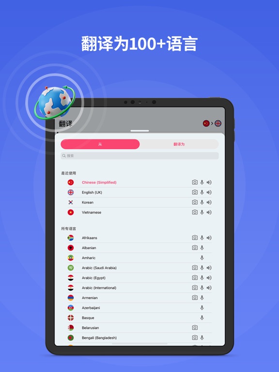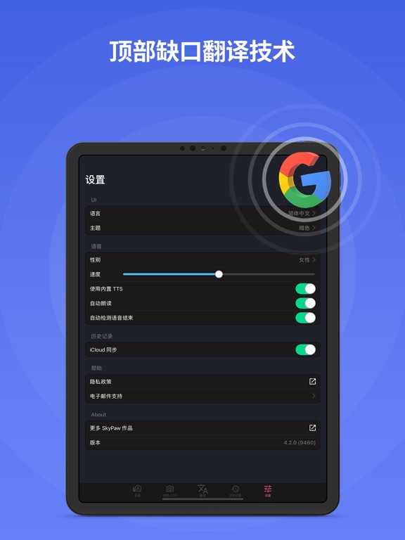 “翻译家 X”是一个强大的翻译器,支持图片、语音和文字翻译。 只需用自己的语言输入、说出或拍下任何短语的照片,本应用就会自动识别和翻译,并念出翻译结果! “翻译家 X”可帮助全球各地的人们随时随地进行有效交流。 对于经常在国外机场、酒店、超市或出租车上进行交流的旅客来说,本应用理想之选。 对于要学习新短语和听正确发音的孩子或成年人来说,本应用也是一种非常有用的学习工具。 物体模式的工作原理: - 拍张照片 - 查看照片中物体的名称 - 翻译成您所选择的语言 图像模式如何工作: - 拍一张打印文本的照片 - 查看已识别并翻译成所选语言的文本 语音模式如何工作: - 通过麦克风用自己的语言说一个短语 - 查看已识别并翻译成所选语言的文本 文本模式工作原理: - 通过键盘以自己的语言输入文字 - 查看已识别并翻译成所选语言的文本 物体模式的工作原理: - 拍张照片 - 查看照片中物体的名称 - 翻译成您所选择的语言 - 听发音 文本模式工作原理: - 拍一张打印文本的照片 - 查看已识别并翻译成所选语言的文本 - 听发音 功能: - 支持 Apple 语音识别技术 - 实时语音识别可显著提高翻译速度 - 文字到文字翻译支持 115 种语言 - 语音到语音翻译支持 39 种语言 - 语音到文音翻译支持 74 种语言 - 具有智能且直观的历史记录,方便保存对话并进行翻译 它也可用作短语书,用于保存您最喜欢的短语和对话 - iCloud 整合:您的翻译历史记录将在您的所有 Apple 设备间同步! - 记录可进行编辑 - 可复制到剪贴板,粘贴并分享记录 - 可通过电子邮件、短信和备忘录等,将所有历史记录导出 - 可配置设置:男性或女性语音、语音速度、自动检测语音结束、翻译后自动说出来 请注意: * 翻译服务由Google翻译™提供 * Google公司提供的语音识别和文本到语音服务 * 语音到语音翻译功能支持下列语言间的翻译: 阿拉伯语、加泰罗尼亚语、中文(粤语)、中文(普通话)、中文(台湾)、捷克语、丹麦语、荷兰语(荷兰)、英语(澳大利亚)、英语(加拿大)、英语(印度)、英语(英国)、英语(美国)、芬兰语、法语、法语(加拿大)、德语、希腊语、希伯来语、印地语、匈牙利语、印尼语、意大利语、日语、韩语、摩尔多瓦语、挪威语、波兰语、葡萄牙语、葡萄牙语(巴西)、罗马尼亚语、俄语、斯洛伐克语、西班牙语、西班牙语(墨西哥)、瑞典语、泰语、土耳其语、 巴斯克语、加利西亚语。 * 语音到文字翻译功能支持下列语言间的翻译: 克罗地亚语、马来语、乌克兰语、越南语、南非荷兰语、保加利亚语、菲律宾语、冰岛语、拉丁语、立陶宛语、波斯语、斯洛文尼亚语、塞尔维亚语、祖鲁语。 * 文字到文字翻译功能支持下列语言间的翻译: 南非荷兰语、阿尔巴尼亚语、阿拉伯语、亚美尼亚语、阿塞拜疆语、巴斯克语、白俄罗斯语、孟加拉语、波斯尼亚语、保加利亚语、加泰罗尼亚语、宿务语、齐切瓦语、中文(粤语)、中文(普通话)、中文(台湾)、克罗地亚语、捷克语、丹麦语、荷兰语(荷兰)、英语(澳大利亚)、英语(加拿大)、英语(印度)、英语(英国)、英语(美国)、世界语、爱沙尼亚语、菲律宾语、芬兰语、法语、法语(加拿大)、加利西亚语、格鲁吉亚语、德语、希腊语、古吉拉特语、海地克里奥尔语、豪萨语、希伯来语、印地语、苗族语、匈牙利语、冰岛语、伊博语、印尼语、爱尔兰语、意大利语、日语、爪哇语、卡纳达语、哈萨克语、高棉语、韩语、老挝语、拉丁语、拉脱维亚语、立陶宛语、马其顿语、马达加斯加语、马来语、马拉雅拉姆语、马耳他语、毛利语、马拉地语、摩尔多瓦语、蒙古语、缅甸语(缅甸)、尼泊尔语、挪威语、波斯语、波兰语、葡萄牙语、葡萄牙语(巴西)、旁遮普语、罗马尼亚语、俄语、塞尔维亚语、塞索托语、僧伽罗语、斯洛伐克语、斯洛文尼亚语、索马里语、西班牙语、西班牙语(墨西哥)、巽他语、斯瓦希里语、瑞典语、塔吉克语、泰米尔语、泰卢固语、泰语、土耳其语、乌克兰语、乌尔都语、乌兹别克语、越南语、威尔士语、意第绪语、约鲁巴语、祖鲁语、阿姆哈拉语、科西嘉语、弗里斯兰语、库尔德语(库曼吉语)、卢森堡语、普什图语、萨摩亚语、绍纳语、信德语、鞑靼语、科萨语、苏格兰盖尔语、巴什基尔语、乌德穆尔特语、克雷塔罗乙巳语、尤卡坦玛雅语、柯尔克孜语。 * 在您确认购买时和每个续费周期开始时,我们会从您的 iTunes 账户中收取订阅费用。 包含免费试用期的订阅将自动续订为付费订阅。 在免费试用期结束前至少 24 小时,您可以在 iTunes 设置中取消您的订阅或免费试用。 取消订阅将会在当前订阅周期最后一天后生效,您将会被降级为免费服务。 * 请注意:在免费试用期内,当您订阅高级版后,任何未使用的免费部分(如果有的话)将会作废。 * 隐私政策: http://www.skypaw.com/translatorx/privacy_policy.html * EULA: http://www.skypaw.com/translatorx/terms.htmlThanks for using Translator X! Here's what's new for the version 4.5.0: ● Fix an error where the special offer for re-subscribers cannot be proceeded ● Upgrade components ● Various improvements & bug fixes