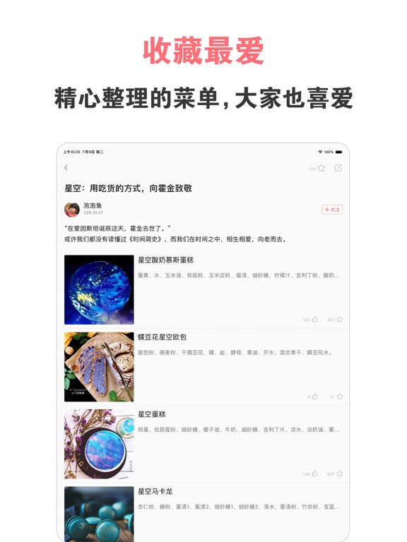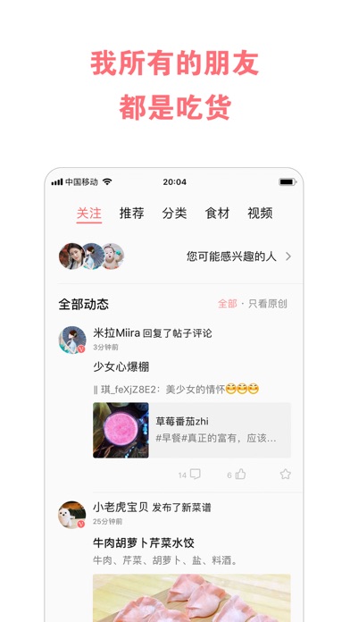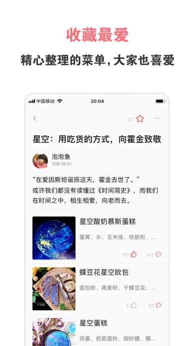 这里是热爱美食、追求美好的吃货社区,汇聚海量菜谱的常备工具,令厨房与餐桌成为一家人妙不可言的愉悦生活。 专注美食的吃货社区,汇聚海量菜谱的常备工具,令厨房与餐桌成为一家人妙不可言的愉悦生活。 在这里,最活跃的美食杰出作者与热爱生活的美食家们,通过锅碗瓢盆、菜豆果蔬,为您呈现图文并茂、无比详细的菜谱,以及挥洒自如、满座惊艳的创意美食。 *** 不忘初心,我们致力做最棒的美食APP *** 【简洁:清新风格,便捷操作】 全新设计的简美界面,配合大量的高清美食图片,使得优质的内容更加凸显。 适配酷酷的深色模式,并优化 iPad 大屏浏览体验。 【高效:海量菜谱,精准直达】 我们将美食天下上百万篇菜谱,结合十多年的运营经验、菜谱大数据,进行了多达14个维度数百种分类。包括家常菜谱、西餐菜谱、烘焙食谱、儿童菜谱,等等。同时我们全新改版搜索功能,无论是菜名还是食材,通过搜索功能,都能直达你的心头好。 汇集早餐、烘焙、凉菜、热菜、小吃、煲汤、川菜、粤菜、孕妇、产妇、婴儿、减肥等食物食谱, 是下厨房必备烹饪软件。 【愉悦:人气社区,美得冒泡】 点赞、关注、整理菜单 —— 放慢生活,为爱洗手做羹汤。享受这种简单而美好的生活方式。 全新装潢的美食广场,使得互动与沟通更加便捷有爱。上传您的美食照片吧,即时得到无数网友的喜欢与反馈! ---- 联系我们 ---- - 微信公众号与微博:美食天下 - 合作与建议:we@meishichina.com四方餐桌事,盏盏人间烟火味。 · 优化菜谱分类内容; · 优化与修复了一些已知的问题。