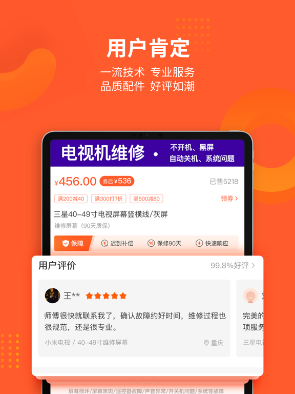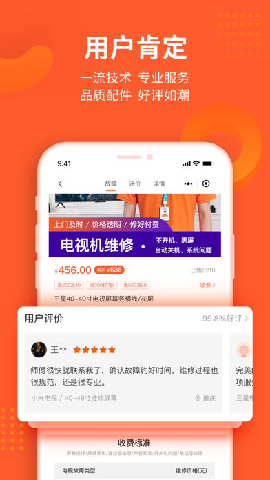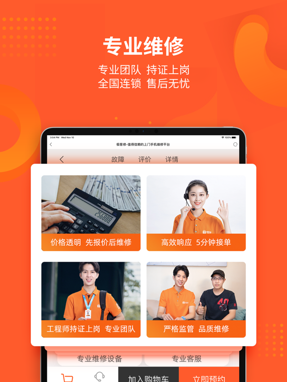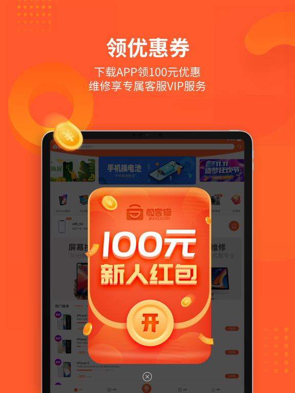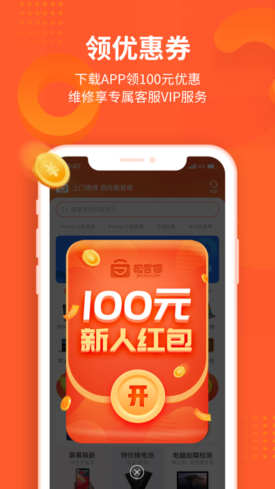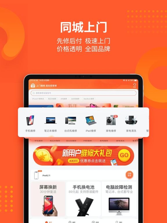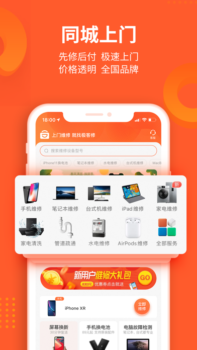 【APP专享】下载APP领100元优惠,维修享专属客服VIP服务。 极客修同城上门维修服务专家;提供手机维修,电脑维修,家电维修,家电清洗,管道疏通,水电维修,家具门窗安装等服务。 >>【先维修,后付款】已服务全国超过1000万的客户,用户好评率高达99%! >>极客修提供优质上门维修服务。通过直营+合伙人的特色城市扩展策略,实现全国连锁。 >>3分钟极速响应、60分钟快速上门、30分钟现场快修。 >>已在全国140多个城市建立维修中心,拥有1000余名专业维修工程师,全部经过考核认证,极客修的业务规模、用户口碑在业界位居前列。 >>2019年,极客修获得2019中国消费者信赖品牌奖。 -- "天猫无忧购” 最佳服务商! -- "京东服务+” 唯一官方授权维修服务商! -- 中国人保、中国平安等碎屏险,官方合作伙伴! 服务项目: 手机维修:换屏幕、华为苹果换电池、碎屏更换、内存升级、电池更新、配件更换、主板维修。 智能设备维修:智能机器人、跑步机、投影仪等智能设备维修。 电脑维修:苹果平板电脑及笔记本电脑维修;台式电脑组装机维修检测。 家电维修:电视维修更换屏幕,开关机问题等维修;洗衣机维修,空调维修、热水器维修、燃气灶维修、油烟机维修、燃气灶维修等; 家电清洗:提供空调清洗,电热水器清洗,油烟机清洗,洗衣机清洗,冰箱清洗,燃气灶清洗等专业清洗服务; 水电维修:灯具维修、灯泡安装更换、开关安装更换,水管维修、电路维修、电器维修、水电维修安装服务等; 管道疏通:马桶疏通、下水道疏通、蹲便疏通、地漏疏通、洗手盆疏通、洗菜盆疏通等; 家具安装:沙发、桌椅、床类、门窗安装维修等维保服务 服务优势: 现已在北京、广州、上海、深圳、重庆、成都等140余个城市开通工程师上门维修服务。 >>高品质零配件 高品质零配件,统一采购,质量有保障。 >>收费公开透明 按实际故障点结算费用,统一报价,一目了然。如需维修工程师评估具体故障点情况,维修工程师将给出维修方案与报价。 服务特点: 快速:3分钟电话客服响应接单,1小时工程师到达指定地点,半小时完成维修 范围:140城全国连锁保修 技术:SaaS自有知识产权系统 培训:极客修学院培训;月度工程师考核机制 质控:神秘人计划监督 品类:维修品类囊括各主流品牌,150余种机型,包括,手机、电脑、家电维修和家电清洗、管道疏通、防水补漏、开锁换锁、水电维修等服务 联系我们: 我们的服务,如果您满意,请给予我好评,我们会再接再厉! 如果您再维修的过程中遇到问题,请及时给我们反馈,我们会为您拼尽全力! 任何意见和建议都可联系我们: 微信:关注“极客修”公众号 官网:www.jikexiu.com 维修有问题,随时致电极客修VIP客服:4008-112-112优化界面内容。
