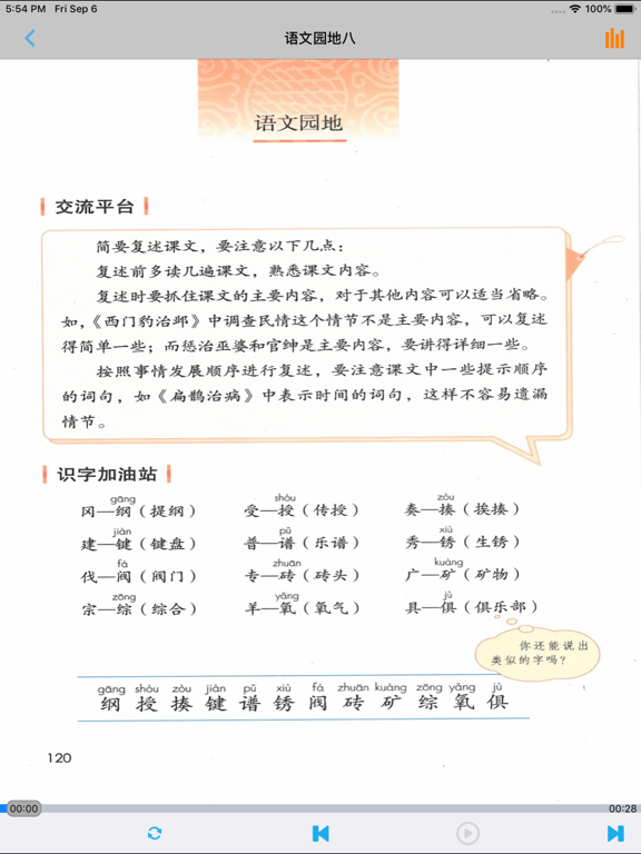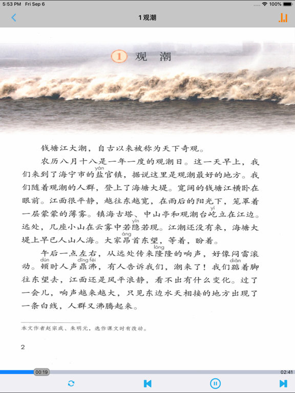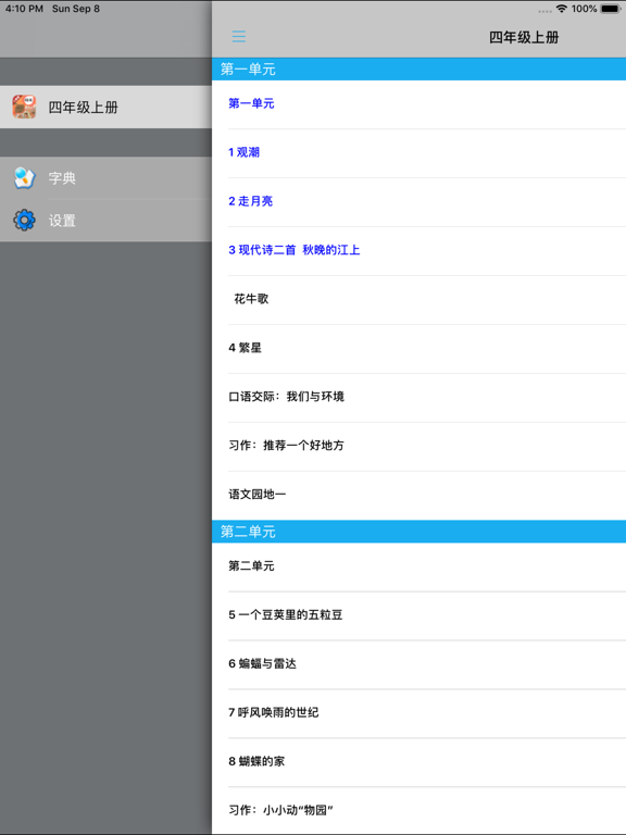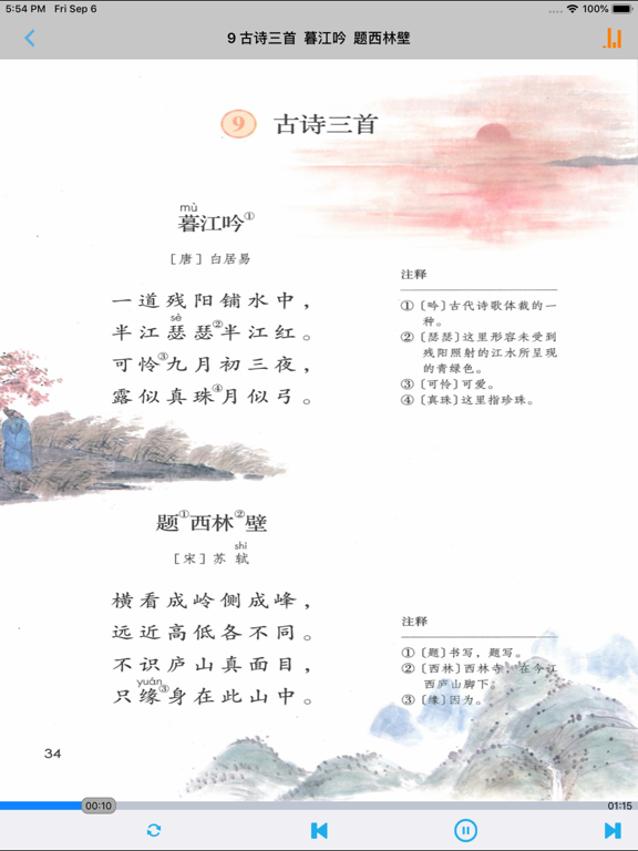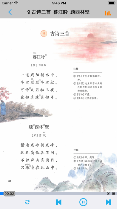 不单单是复读,【E-Learning】应用系列让您的iPad和iPhone变成学习机! 学生通过它随时随地完成课前预习、课后复习,学习能力更胜一筹! ***** 完全匹配教材,操作简便,哪里不会点哪里 ***** *根据教材配套,此应用为2019年人教版(部编版)小学语文四年级上册完全最新版。 *涵盖教材全部内容,让您全面掌握拼音字母、生字、词语、句子、课文、故事、诗歌等课程内容。 *全套原版录音和教材完全同步,助您成为中文大明星。 *操作简便、携带方便,从此抛弃磁带和光盘。 【E-Learning】应用系列同步教材制作,内容完全一致,您可以使用它来进行课文学习,播放教材配套音频,配乐读音准确清晰,寓教于乐,让学习更高效和有趣! 此应用将成为孩子自学的专属外教,把家长从繁琐的辅导解答中解放出来!能点、能读、更能说,是学生的好老师、好家长! So easy!妈妈再也不用担心我的学习了,哪里不会点哪里! 功能特色 - 配乐读音准确清晰,怡情养性,陶冶情操。 - 内容与录音质量放心,语音纯正、朗诵有配乐。 - 语音播放灵活,快速翻页,目录跳转。 - 任意位置即点即学,复读模仿随时随地。 - 完全同步教材制作,内容完全一致。 - 支持后台播放,锁屏状态可随身听读。 - 界面简单大方,意图明了,功能实用,操作方便。 —【E-Learning】应用系列 — 适用于多种教学场景,您可以更加便捷地进行碎片化学习,期待您的使用! 致力于为中国K12教育提供最优秀的互联网教育应用软件! E-Learning乐园,伴随青少年健康快乐的成长! *****软件功能***** 1.通用应用,同时支持iPhone,iPod touch,iPad设备 2.可以自动顺序播放功能 3.可以自动记录播放位置,不用担心下次找不到听到哪 4.支持离线播放,即使不联网也一样听,到哪都不怕 5.支持手动拖拽前进、后退播放 6.在兼顾软件容量以及更多课程的情况下,我们最大限度保证音频的高质量,每个有声读物片段都是经过我们精选和亲测 7.最最重要的功能,可以拖动字幕定位,音频随之定位 本应用与《义务教育教科书2019年人教版(部编版)小学语文四年级上册》课本同步 新版目录: 第一单元 1 观潮 2 走月亮 3 现代诗二首 秋晚的江上 花牛歌 4 繁星 口语交际:我们与环境 习作:推荐一个好地方 语文园地一 第二单元 5 一个豆荚里的五粒豆 6 蝙蝠与雷达 7 呼风唤雨的世纪 8 蝴蝶的家 习作:小小动“物园” 语文园地二 第三单元 9 古诗三首 暮江吟 题西林壁 雪梅 10 爬山虎的脚 11 蟋蟀的住宅 口语交际:爱护眼睛,保护视力 习作:写观察日记 语文园地三 第四单元 12 盘古开天地 13 精卫填海 14 普罗米修斯 15 女娲补天 习作:我和_过一天 语文园地四 快乐读书吧 第五单元 16 麻雀 17 爬天都峰 习作例文:我家的杏熟了 小木船 习作:生活万花筒 第六单元 18 牛和鹅 19 一只窝囊的大老虎 20 陀螺 口语交际:安慰 习作:记一次游戏 语文园地六 第七单元 21 古诗三首 出塞 凉州词 夏日绝句 22 为中华之崛起而读书 23 梅兰芳蓄须 24 延安,我把你追寻 习作:写信 语文园地七 第八单元 25 王戎不取道旁李 26 西门豹治邺 27 故事二则 扁鹊治病 纪昌学射 口语交际:讲历史人物故事 习作:我的心钱怦怦跳 语文园地八 识写表 写字表 词语表- 适配各机型屏幕; - 修改已知问题; - 优化系统。