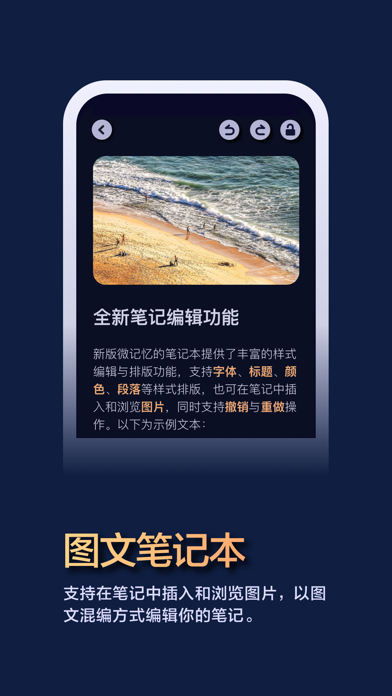 AppStore「编辑精选」- 优秀新鲜App推荐 • AppStore「Today」- 生活解决方案推荐 • AppStore 历史付费效率榜Top1、总榜Top3 • 知名数字生活媒体 AppSo 与 iFanr 联合推荐 ******************************************** 「 App综合介绍 」 微记忆是App Store唯一一款融合了: 【便签+笔记+打卡+记账】 等多种记录功能于一体的工具效率类App。 生活中任何与“记”相关的事务,微记忆都可帮你有条理地记录和统计,让你更高效、更方便地处理以下事务: —【每日待办事项】 —【任务到点提醒】 —【学习与工作笔记】 —【富文本排版】 —【笔记标签分类】 —【签到打卡】 —【签到数据统计】 —【每日收支详情】 —【消费记录查询】 —【账户统计】 —【隐私记录加密】 —【数据备份与恢复】 只需一个App,你将【同时拥有】上述多项与生活记录密切相关的功能,无需分别为每项功能单独安装一个App。 「 App特色功能 」 便利贴 ▶ 多种颜色标记,区分轻重缓急; ▶ 设有【待办】、【星标】和【已办】三个分类栏目,方便管理各类事项; ▶ 依据待办事项的类型,可自由移动便利贴至相应栏目; ▶ 依据待办事项的轻重缓急,可自由拖动便利贴排序; ▶ 每张便利贴可单独设置【提醒时间】与【提醒周期】,重要事项分开提醒,不再遗漏。 笔记本 ▶ 支持【富文本】样式编辑,可对字体、颜色、段落等样式进行设计排版; ▶ 支持【图片】插入与浏览; ▶ 支持【加密】笔记,对重要隐私内容笔记进行保护。 ▶ 支持【标签】分类,可对笔记进行分组标记并归类。 打卡器 ▶ 日历打卡视图布局,每日签到打卡情况一目了然; ▶ 提供【8种】不同的打卡事项供选择,同时管理不同的打卡任务; ▶ 支持添加日历文字备注: ▶ 历史数据统计:可查看【每月已打卡】、【历史最长打卡天数】、【每月已间断】、【历史最长间断天数】等详细统计信息,全方位分析了解打卡情况。 小账本 ▶ 提供数十种收支图标,直观地记录各种收入和支出分类; ▶ 提供【日期查询】:可查看指定日期或任意日期范围内的收支记录; ▶ 提供【备注搜索】:可按关键字搜索、查看和修改历史收支记录; ▶ 支持单独查看指定类别的收支清单; ▶ 支持按【月度】、【季度】或【年度】对所有收支记录进行统计,分析各类收支类别的总额、占比与详细清单。清晰了解每一笔收支,更高效地规划理财。 *********************************** 有任何疑问或建议,随时欢迎联系 micro_memory@163.com ***********************************• 优化账号登录与云存储服务