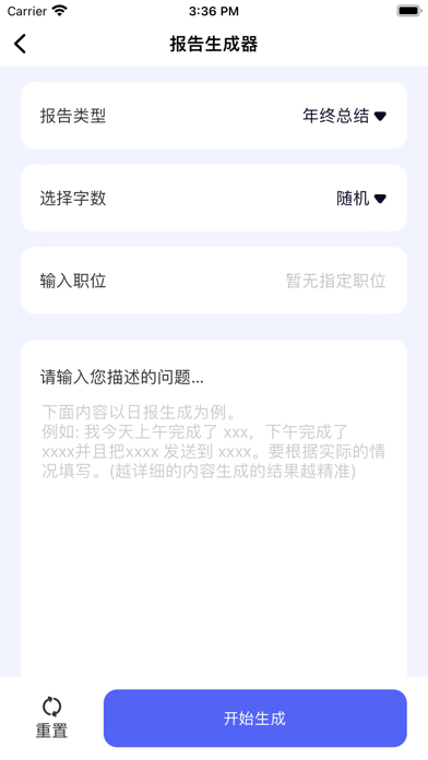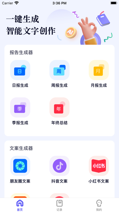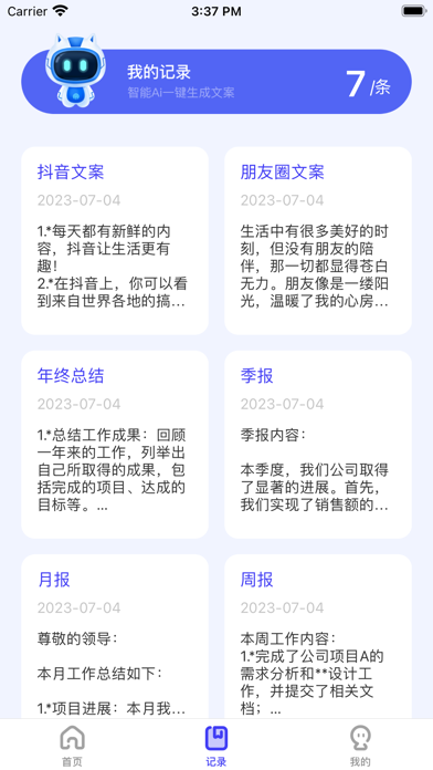 一、简介 文案生成宝是一款旨在通过AI技术为用户提供高质量、多样化且富有创意的文案。无论您需要撰写日报、周报、年终总结以及朋友圈文案等,文案生成宝都能够帮助您快速完成任务,提高工作效率。 二、主要功能 多类型文案生成:支持各种类型的文案生成,包括广告、标语、社交媒体、博客文章、产品描述、邮件、活动邀请等。 风格类型自由切换:用户可根据需求选择不同的文案风格和类型,如正式、幽默、引人入胜、情感化等,以满足不同场景的需求。 一键生成文案:通过输入简单描述,文案生成器将为您生成富有创意和吸引力的顶级文案。 模板库:提供丰富的预设模板,涵盖各行各业,方便用户根据需求快速选择和修改。 实时查看:生成文案后,用户可通过历史随时查看回顾文案,也可通过复制重复使用。 付费说明: 付款:确认购买并付款后,会从您的苹果iTunes账户扣费; 取消续订:如需取消续订,请在当前订阅周期到期前24小时,在iTunes/Apple ID设置管理中关闭,关闭后不再扣费; 续费会员:苹果iTunes账户会在到期前24小时内扣费,扣费成功后订阅周期顺延一个订阅周期,永久会员套餐无续费功能。 隐私协议:https://sparkly-narwhal-fdd.notion.site/21fa3df579d3805a99d5fe73c9b584a0?source=copy_link 用户协议:https://sparkly-narwhal-fdd.notion.site/21fa3df579d380878c91c6fb035a6e28?source=copy_link 会员续费服务协议:https://sparkly-narwhal-fdd.notion.site/21fa3df579d38058ae5dd332c1698574?source=copy_link修复生成文案字数相差较多的问题; 一些细节修改,提升用户体验。
