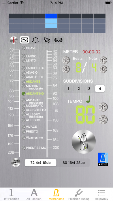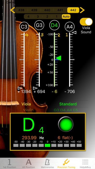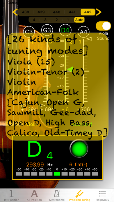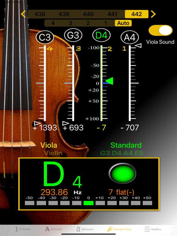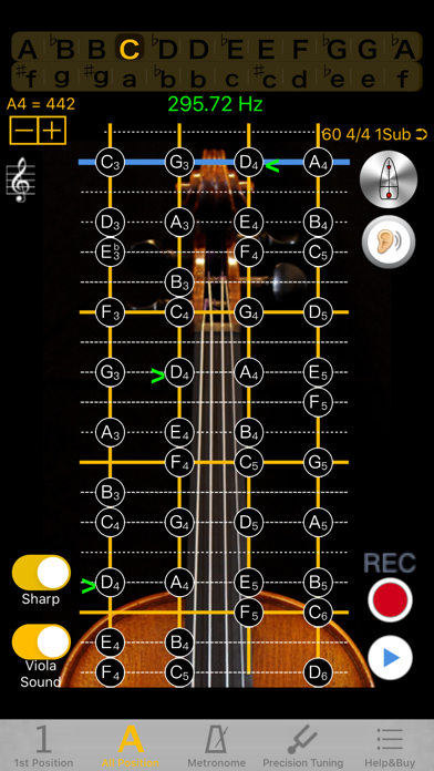 [1把位 & 全把位音准练习] - 支持24种大小调选择: A, bB, B, C, bD, D, bE, E, F, bG, G, bA, #f, g, #g, a, bb, b, c, #c, d, be, e, f - 支持A4 频率调整 : 428~452频率切换. - 支持背景节拍声:在节拍器页面设定返回. - 支持录音回放:供演奏者回顾演奏过程中音准问题. - 演奏时, 可边显示音准,背景节拍声并同时录音录. 帮助演奏者, 同时校准音准和节奏. 初学者不妨试试演奏任一C大调练习曲, 感受带给您的帮助. - 使用全把位图, 可以即时反馈左手在琴弦的移动是否到位, 可帮助学琴者, 更好掌握例如:8度跳跃. 对于换把练习也是有一样的助益. [节拍器] - 操作画面直觉简易, 所有功能在同一页面即可设定完成. - 直观的节拍模式选择, 18种, 包含 : Grave 25-45 / Largo 40-60 / Lento 45-60 / Larghetto 60-66 / Adagio 66-76 / Adagietto 72-76 / Andante 76-108 / Andantino 80-108 / Marcia moderato 83-85 /Andante moderato 92-112 / Moderato 108-120 / Allegretto 112-120 / 116-120/ Allegro 120-156 / Vivace 156-176 / Vivacissimo 172-176 / Presto 168-200 / Prestissimo 200 bpm and over - 支持"细分节拍”功能, 双倍,三倍和四倍节拍细分 - 支持自定义节拍设置2组,可以存储和加载 - 支持钟摆显示模式 - 支持程序内音量调节,调节音量更加快捷 - 计时显示 帮助掌控练习时间 - 使用RTP(Real Time Playback)模式,节拍精准,并且支持动态变速换音 - 4种节拍声音可供选择 [精准调音] - 简单设定画面上方的频率及中间的调子, 弹奏, 调音结果即时显于对应的弦位置上. - 支持26种调音模式 : Viola(15), Violin-Tenor(2), Violin和American-Folk [Cajun, Open G, Sawmill, Gee-dad, Open D, High Bass, Calico, Old-Timey D] - 校准音 : 点击刻度尺上方的空弦音名按键, 发出相应参考音. - 支持A4 频率调整 : 428~452频率切换. 使用画面上方, 左右两边箭头. - 刻度尺 : 画面上弦刻度尺, 正中央线为空弦音准位置, 绿色三角箭头指向此, 表示调音准了. 刻度尺每格为10分位(cents), 超出范围时, 绿色三角箭头变成暗灰色. 刻度尺下方会显示音分差, +号代表高, 请调松弦, 反之 -号代表低, 请调紧弦. - 显示面板 : 显示相近音名(白色), 音准时, 音名会变成绿色, 调音正确时, 会出现绿色灯号, 下方的LED也会相应移动, 显示高低10cents(分位)情形. 更视觉化. 期望能成为提琴学习者, 老师不在身旁, 自学时的好伴侣. 让您的学琴过程更加愉快,我们会努力为大家做出更多好用的音乐应用,感谢大家的支持,。 欢迎以e-mail联系我们.Bug fixes for iO3 13