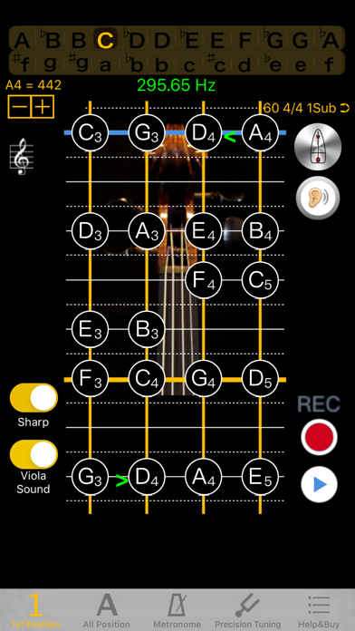 包含1把位 & 全把位音准练习, 节拍器和精准调音, 三大功能. 简洁的使用介面, 图示音准位置, 噪音过滤, 音准显示稳定, 无需任何设定, 打开APP, 演奏时, 自动将音准显示于画面弦上的相对应位置, 比对自己左手按弦位置是否正确, 可以有效提升音准感, 特别是音准感不佳及不熟习把位的学习者. 彻底解决, 左手按弦换把位时, 身旁没老师纠正音准的痛苦.
