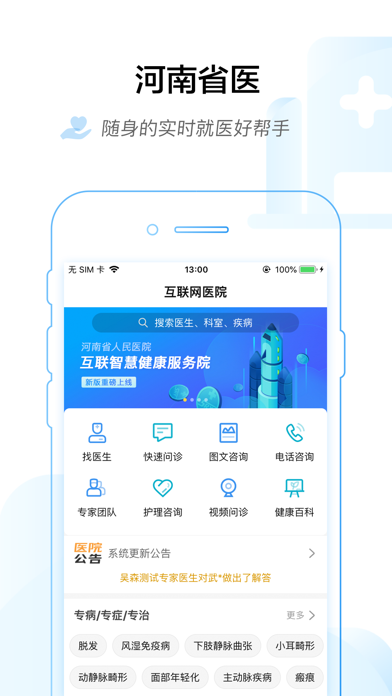 “河南省医”是河南省人民医院以移动互联网、云计算、物联网、大数据等特点“智慧化”信息服务。“河南省医”旨在医院现有服务基础上,通过预约挂号、科室医生、智能导诊、医院导航、健康资讯、健康百科等多种简化患者就医流程功能,减少就医等候时间,改善患者就医体验,提高医疗服务质量。 -----主要功能----- 1.预约挂号:掌上预约挂号,短信凭证高效就诊; 2.报告查询:报告随身带,看病有备无患; 3.科室医生:一键查看各科室当月医生排班; 4.健康百科:海量健康小知识,守护家庭健康; 5.智能导诊:哪里不适点哪里,模拟医生问诊,推荐相关科室,帮您针对性挂号; 6.健康咨讯:实时更新健康咨询,了解最新动态; 7.医院导航:楼层、周边商户导航,守护健康。【】优化】启动页更换
