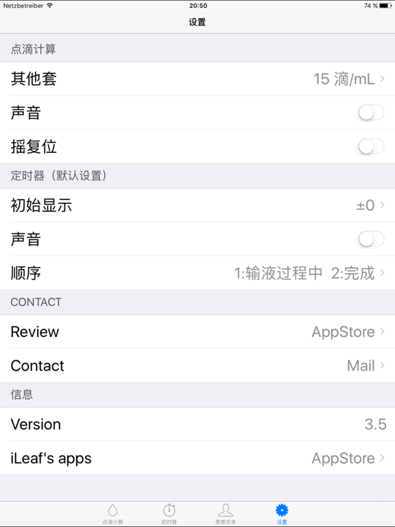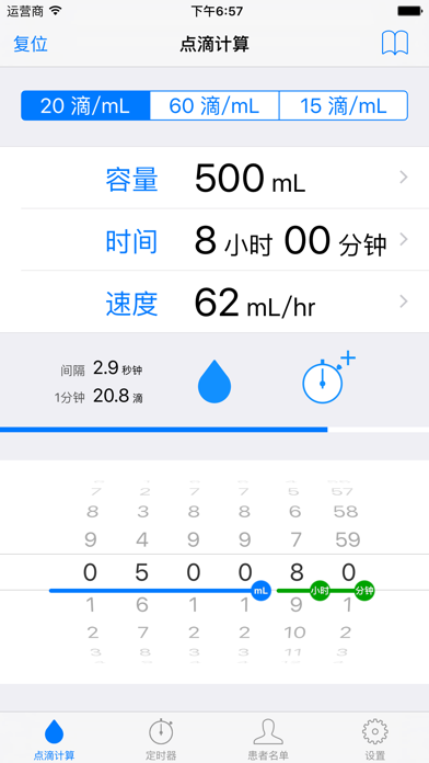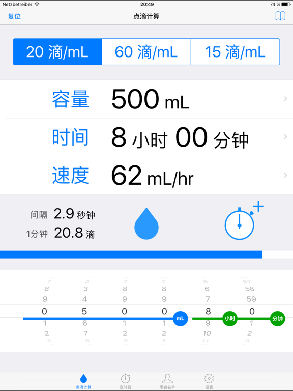 通过设置所需的时间和输液量这个程序计算滴速。 蓝色进度条和闪烁的图像,显示下探区间。 滴速计算 - 有一个 20滴/mL 和 60滴/mL 输液器初始显示的。 - 如果你需要其他的输液器,你可以添加任意设定。(1-99 滴/mL) - 这算“速率”设置“音量”和“时间”。 - 这算“时间”设置“速率”和“音量”。 - 它通过设置“时间”和“速率”计算“音量”。 - 闪烁的图像就能挖掘。 定时器 - 该列表显示剩余输液时间。 病员名单 - 名称,房间,备忘录,可以注册。 - 名称可以用作定时器的显示。 Apple关注支持 - 通过设置输液器(20/60/15),所需的时间和输液量显示滴速。 - 掉落率是由圆圈显示,时间轮将被丢弃的时间间隔。 [注意] 此应用程序支持IOS9以上。 共鸣功能仅适用于iPhone。没有在iPod和iPad的共鸣功能。 【免责事项] 此应用程序是不是一个东西承担责任的医疗服务。请与用户的责任使用。- Support iOS15 - Support WatchOS8