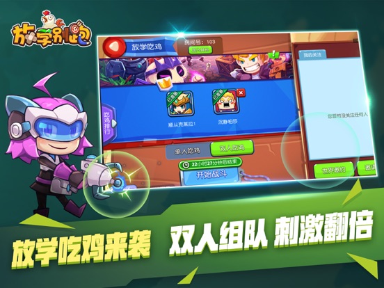 欢乐大乱斗,开黑只需5分钟。 轻松诙谐的2D卡通画风,轻松简单易上手、高自由度的战斗、灵巧飘逸的走位,给你欲罢不能的全新体验! 众多玩法,丰富你的碎片时间 全新求生模式、经典竞技模式、开心娱乐模式等众多丰富玩法,精彩刺激,就是要带你消灭无聊,打败节操! 5分钟精彩对决 与各路玩家随时随地开启一场5分钟的对局,迅速进入战斗状态,敌人就在家门口,莫怂,正面刚!成就荣耀王者就在此刻! 英雄技能丰富 火力全开的全能战士、能防御一切伤害的铁锤、无限回血光环的酋长、携带“混乱药剂”的炼金术师……诸多天赋异禀身怀绝技的英雄们还有10秒到达战场,他们将采用技能发出致命一击,准备接招吧! 角色随心切换 战斗局势不停变化,因此,需要根据不同的时局切换新英雄,以适应战局,KO对手。每一局随时都有不同的COOOOOL~玩出更多花样! 自动射击操作灵活 游戏打破传统的舒服,采用自动射击的战斗,随时随地,只要灵活走位、合理释放大招,即可体验一场酣畅淋漓的战斗! 放学别跑官方微博:放学别跑手游修复已知BUG