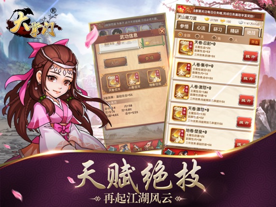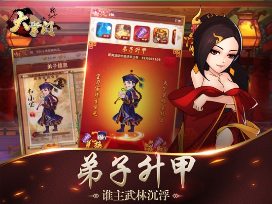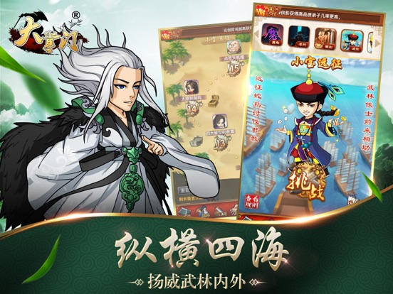 有人的地方便有江湖,《大掌门》是一款集冒险、养成、策略、奇遇、战斗等元素于一身的武侠策略RPG手游,游戏中玩家将化身一代武学宗师,招收江湖知名侠客为弟子,打造神兵利器,修炼绝世武功,经历各种艰苦磨难和奇遇,挑战魔教势力,参加一场场论剑比武,最终打败各大门派立于武林之巅,从此称霸江湖。 《大掌门》是玩蟹科技旗舰巨作,国民级经典武侠手游,曾多次登顶AppStore双榜第一,注册玩家超3500余万,火爆3年,热度不减。如今10载传奇,创一代手游神话。 时值大掌门八周年之际,众多经典人物传记重造,更续当年风采。逍遥子传记携逍遥派再战武林群侠。神雕侠侣重返江湖,再造武林神话。共修武功,齐力破敌。更有江湖秘宝神兵利器,及绝世神功陆续问世,江湖纷争一触即发!全新江湖全新篇章,等掌门再来闯荡! 游戏特色 【纯正武侠 正统江湖】 水墨武侠画风,原汁原味还原守卫襄阳、论剑华山、奇遇无量洞等经典武侠情节,玩家化身一代掌门,招募弟子组建门派征战江湖。 【英雄收集 自由养成】 知名侠客悉数登场,收集最强英雄为你而战,高度还原英雄绝学武功,自由养成弟子,属性全盘掌控。 【神兵绝学 为你所用】 海量神兵任你挑选,武林至尊屠龙刀,削铁如泥鱼肠剑;各种神功武学无论是易筋经,亦或是洗髓经等均可自由修炼,为你所用! 【策略至上 激情对飙】 战斗阵型随机变换,百名侠客弟子缘分任意搭配,激活侠客间的缘分关系,大幅增强团队战斗力,策略战斗乐趣无穷。 【玩法丰富 海量福利】 超多热血玩法全面开放,“决战紫禁”、“联盟劫镖”“血战襄阳”、“华山论剑”,多重挑战副本,全天多样活动,免费送海量元宝、道具奖励。 官方微博: @大掌门游戏: http://weibo.com/dazhangmen