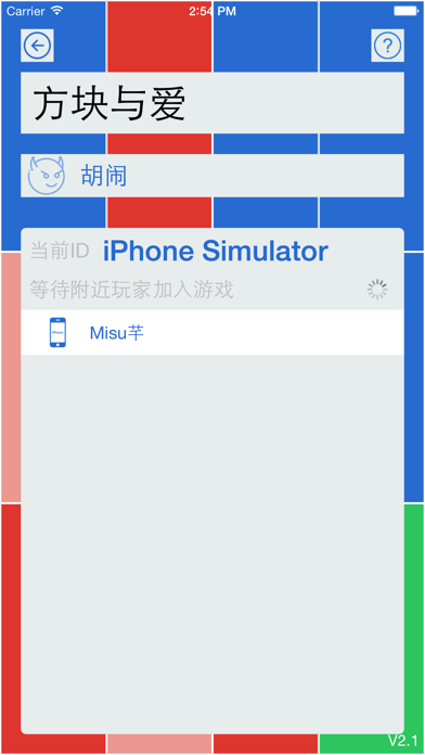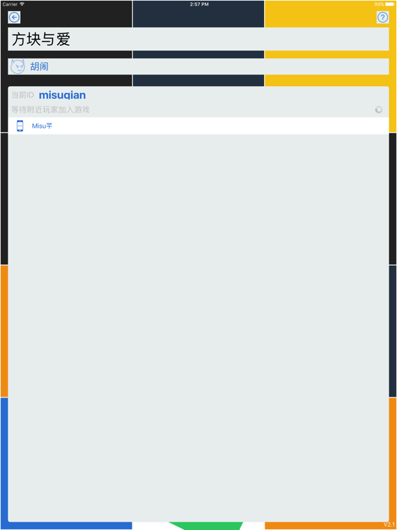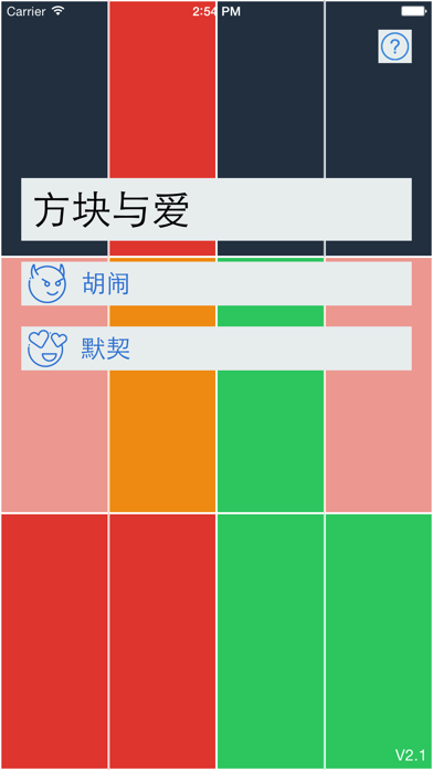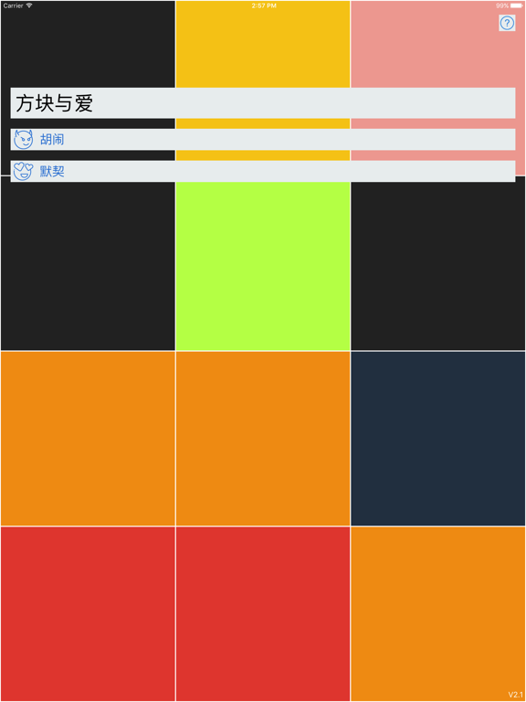 方块与爱是一款简单容易上手的双人互动小游戏,在相同Wifi或热点,蓝牙即可连接,无需联网,适合两人在无聊情况下打发时间。 「方块与爱」志在促进情侣或朋友间交流。如果你愿意,请将此游戏分享给你的朋友,两人靠在一起,连接同一Wifi或者热点甚至蓝牙,参与游戏互动吧 「胡闹」模式:疯狂抢占方块。将方块染为自己的颜色,维持一定抢占数量三秒即获胜。 「默契」模式:合作交换方块。将对方方块染为自己的颜色,同一层全部交换完毕后进入下一层。点到自己的方块将重新开始。 如有任何建议或BUG反馈,欢迎发送邮件至:misuqian@gamil.comApple 已更新此 App 以显示 Apple Watch App 图标。 全新版本,体验优化: 1.界面UI大修改 2.修复了联机可能出现的闪退的情况 2.优化了游戏开始时间不同步问题 3.优化了游戏中延迟较大问题 4.增加暂停,重新开始功能 5.增加时间限制功能 如果你喜欢方块与爱,请将它分享给身边的朋友。谢谢大家的支持