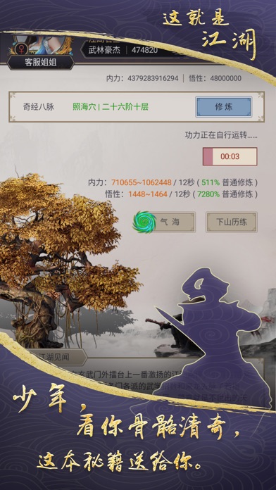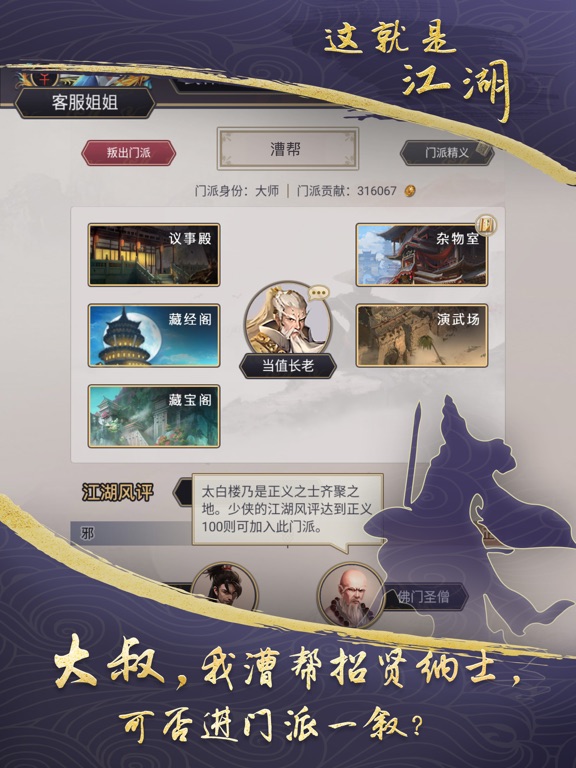 AppStore中独树一帜的放置类开放式文字武侠RPG,走过路过别错过。看少侠骨骼清奇,是个练武奇才,何不和千万玩家一同开启不一样的江湖之旅。 小游戏大内容,急速客服,欢迎大家一起来玩。 江湖之中,不一样的人生,从这里开始。 加入千百门派,刀,枪,剑,棍,十八般武学任修习; 游戏世俗,神兵利器,正邪风云,任凭心意。 游历江湖,血雨楼,月神迷宫,真武八卦阵,唐门追魂阵任你闯; 探索武林,离奇情节,天外飞仙,如来神掌的谜团等你揭开; 漫漫江湖,风云榜,兵器谱,塞北马场,江湖传奇等你谱写。 江湖笑,爱逍遥; 江湖俏,多美妙; 江湖人来人往,何处是我家乡; 江湖熙熙攘攘,夕阳血染疆场; 爱江湖,恨江湖; 身不由己,江湖人在江湖。 ----------------------------------------- 【官方Q群】 这就是江湖官方14群:867556351 这就是江湖官方13群:490535592 这就是江湖官方12群:428621821 这就是江湖官方11群:454096062 这就是江湖官方10群:421103274 这就是江湖官方9群:340032931 这就是江湖官方8群:712836266 这就是江湖官方7群:862334690 这就是江湖官方6群:623988700 这就是江湖官方5群:573045190 这就是江湖官方4群:710840075 这就是江湖官方3群:630338636 这就是江湖官方2群:756762368 这就是江湖官方1群:7066670631、玉带街-重阳将在10月末举行,届时大侠可前往玉带街轻松获得武学和各种奇珍异宝。 2、现在大侠可在红尘客栈开放期间,提升弟子的横炼与暗劲了。 3、现在武痴吴铁花讲出现在明月集内,大侠可在其处兑换以下武学精要:血影破空剑、飞星流云踢、霸王独尊枪、天穹盘空棍、太极天罡掌、太清须弥功。