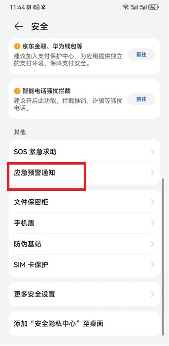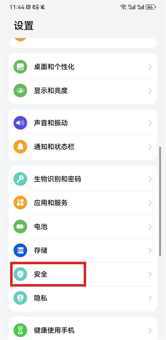 2、在设置界面滑动找到【安全】功能,进入到此界面去打开地震语境功能;