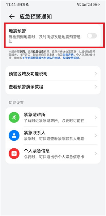 4、在这个功能页面就可以看到【地震预警】功能,当检测到地震的时候,地震中心将会向所有有此功能的手机发送地震预警通知,会有倒计时的警报提醒我们逃离;