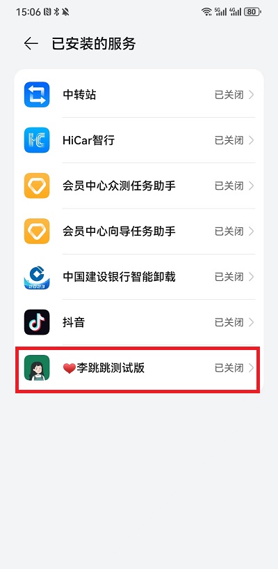 4、在此页面中,可以看到有李跳跳这个软件,右边显示的是【已关闭】按钮,点击进入功能设置界面去打开;