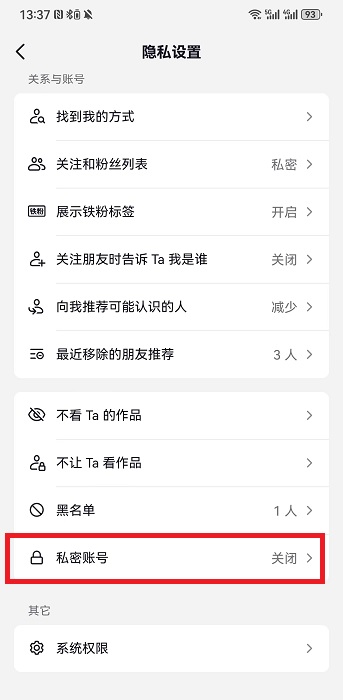 4、在隐私功能界面可以在最下面找到【私密账号】,点击去进行开启;