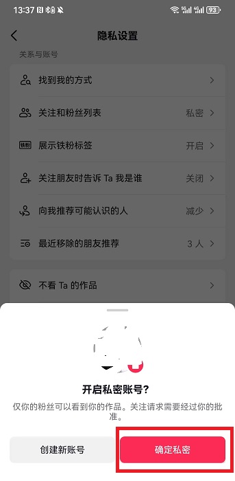5、点击之后会在屏幕下方呈现出来选项,你可以选择【确认私密】就可以设置账号为私密账号。