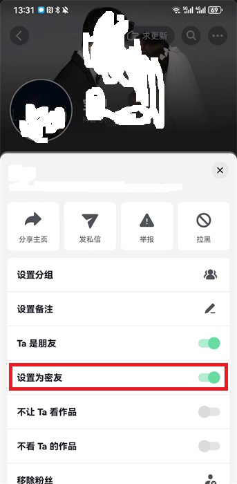 5、然后你就可以看到【设置为密友】的按钮是打开的,只需要关闭就可以取消对方密友身份。