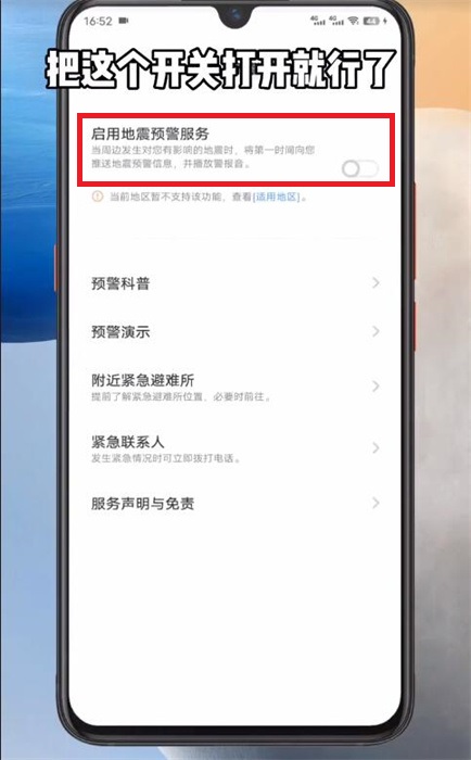 5、在地震预警功能中只需要【打开按钮】,同意授权然后按照步骤的提示即可完成打开教程。