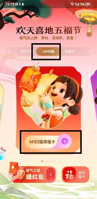 2、在活动之中,需要在上方找到【AR扫福】,这样才能去进行扫福,我们可以点击下方的【AR扫福得福卡】就可以去进行扫福;